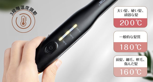 コードレスヘアアイロンは160℃、 180℃、 200℃の3段階の温度調節が可能です。160℃の場合は細くて柔らかい髪、前髪に適用し、200℃は太くて硬い髪に適用します。このヘアアイロン1本でカール、ストレートの2Way対応ができます。