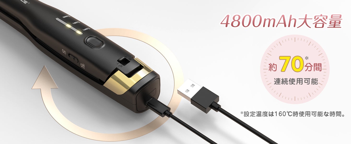 本ストレートヘアアイロンは4800mAh大容量の内蔵型電池を搭載し、フル充電で160℃の場合は70分間連続使用が可能です。5 V/2 A(Type-C USB)充電仕様で、他に比べて充電時間が短く、約120分で充電が完了します。
