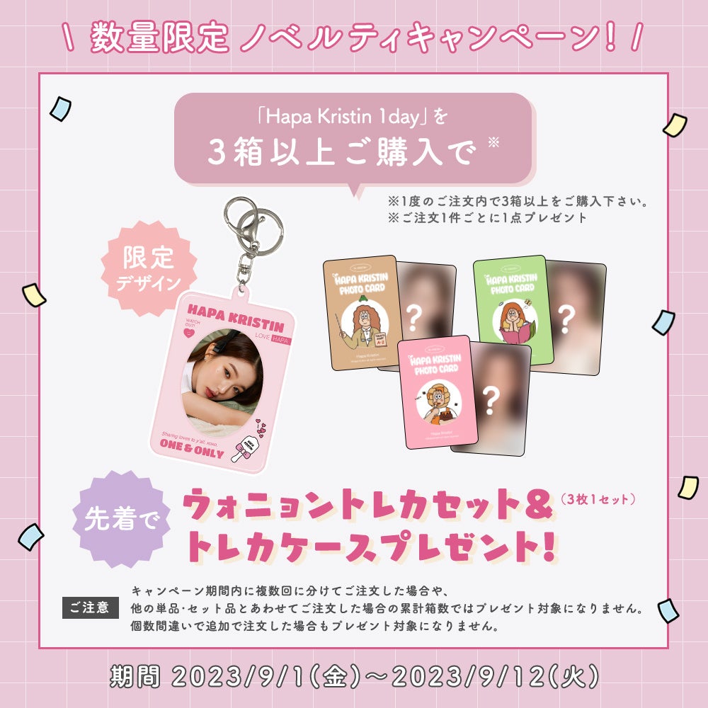 新色Sugar High Kristinを含む「Hapa Kristin 1day」を3箱以上ご購入で、ウォニョントレカ1セット(3枚)&トレカケースをプレゼント。
