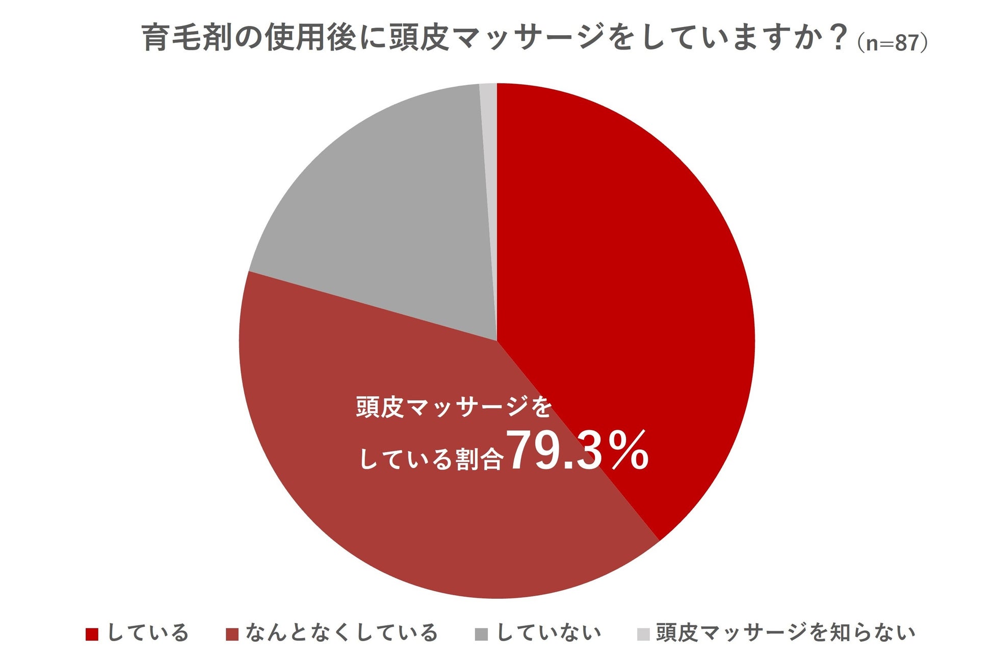 育毛剤の有効成分をより浸透させるためには、育毛剤の使用後に頭皮マッサージを行うことが効果的です。調査結果からは、効果的な使用タイミングの認知度とは反対に「育毛剤+頭皮マッサージ」という認識は比較的高いことが分かりました。