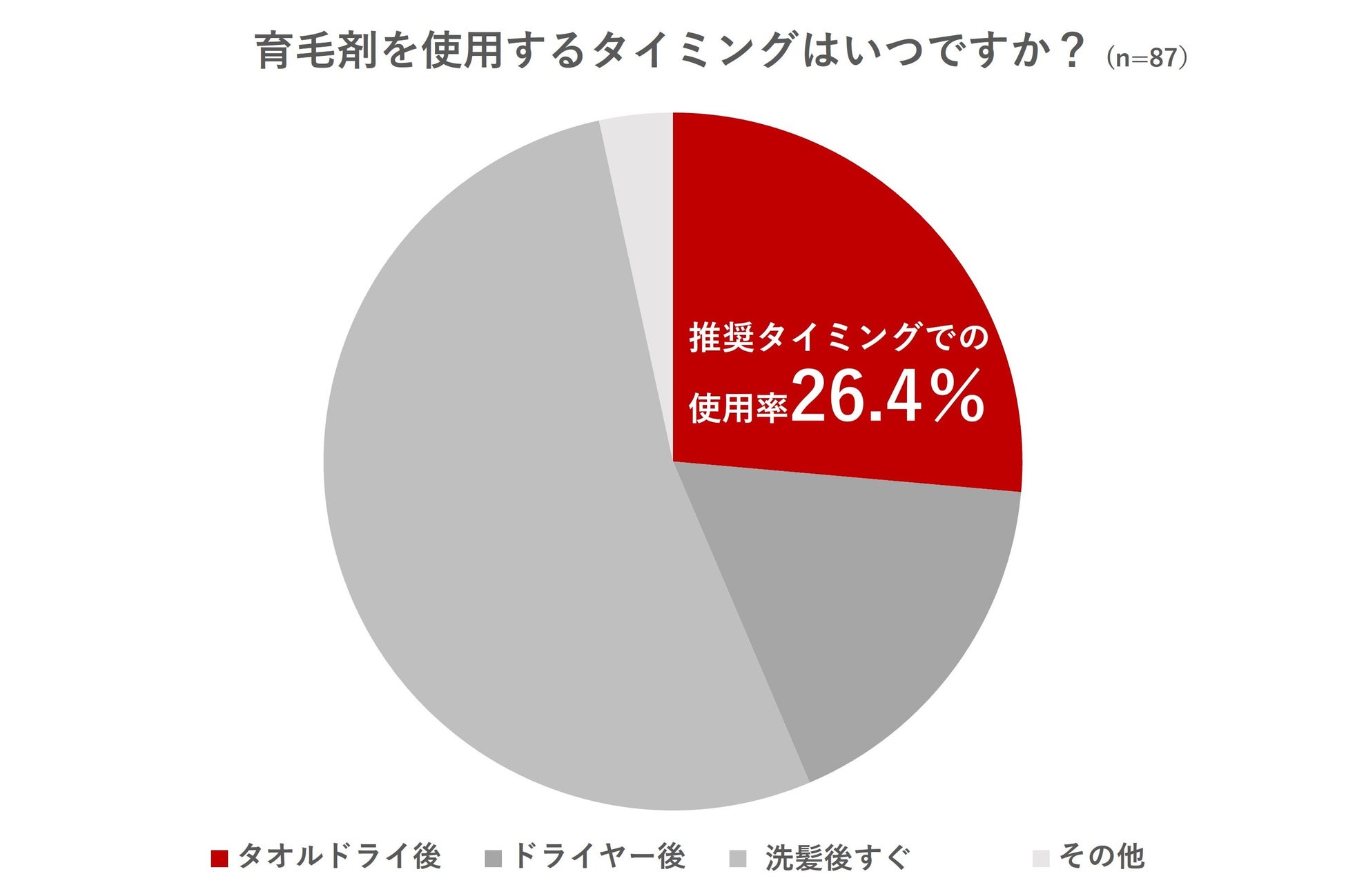 しかし調査によると、タオルドライ後に育毛剤を使用する人はおよそ26%。約7割の育毛剤ユーザーが「洗髪後すぐ」に育毛剤を使用していることが分かりました。洗髪で頭皮や髪の毛を清潔にすると同時に、タオルドライもおこなったタイミングで育毛剤を使用しましょう。