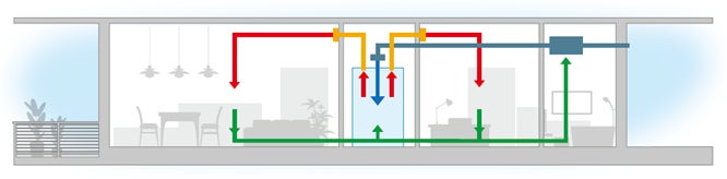 ・長谷工が共同開発した、マンション専有部向け全館空調熱交換気システム「with airⓇ CUBE(ウィズエアーキューブ)」を採用しています。長谷工技術研究所内の住宅実験棟での実験にて、就寝時のCO2濃度を就寝環境として良好とされる1000ppm以下に保つ特長が確認されており、睡眠の質の向上が期待されています。