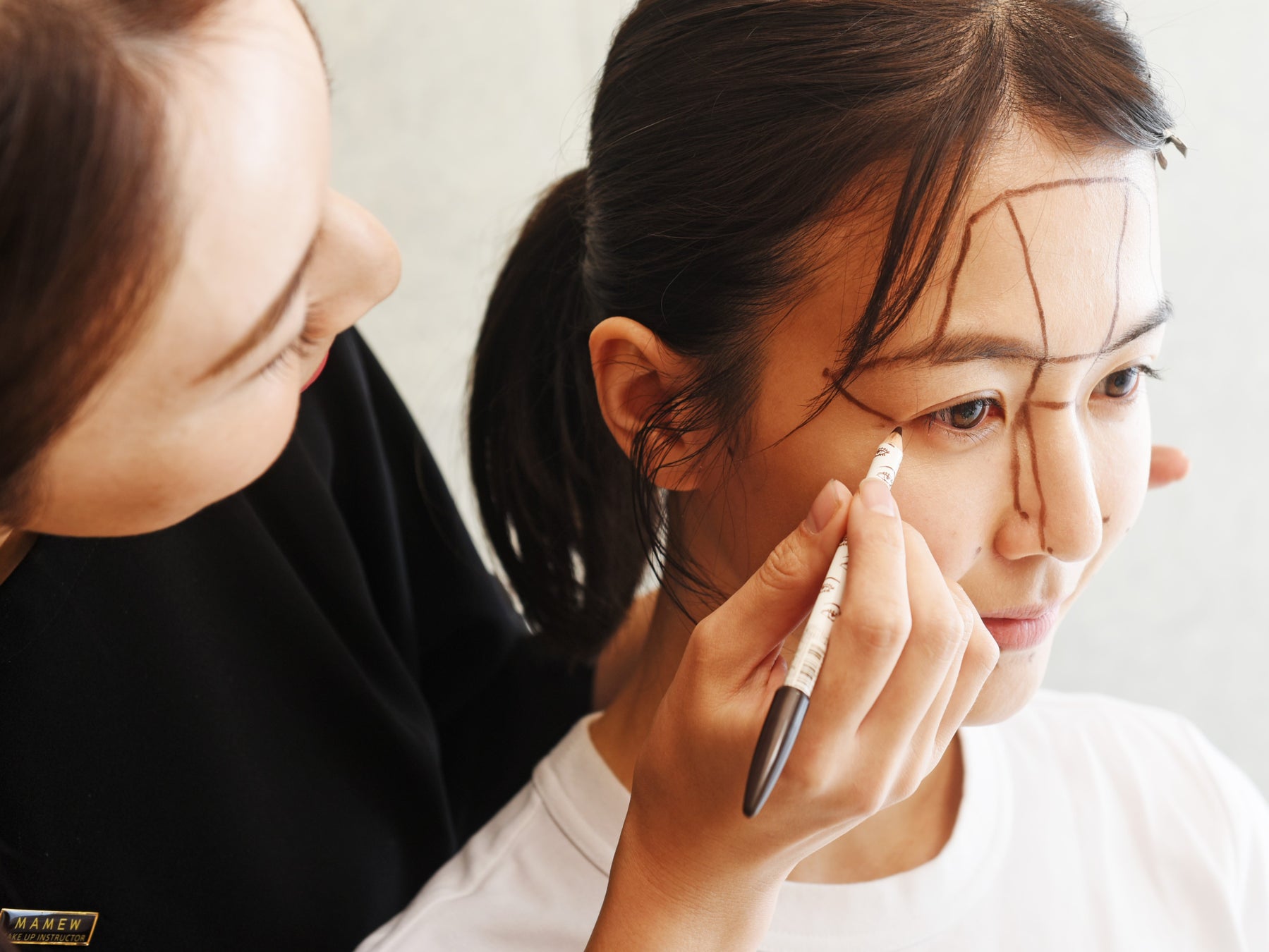 設立から15年以上お客さまの顔を分析し続けてきた「MAMEW」独自の診断方法。一人ひとり違う「骨と筋肉」のバランスに着目し、顔に線を描くブロッキングで丁寧に診断していきます。“なんとなく”ではなく理論的にお客さまにベストなメイクをご提案いたします。