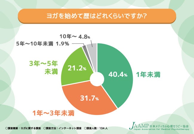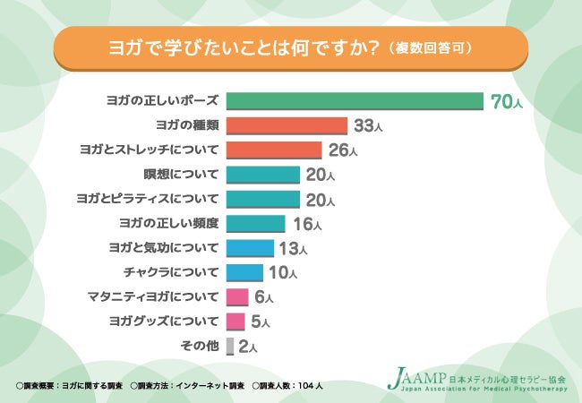 そこで今回、ヨガライフセラピスト®資格認定試験(https://www.domap.net/biyo/yoga/)を主催する日本メディカル心理セラピー協会(https://www.domap.net/)は、全国20代〜60代の男女104名を対象に「ヨガ」に関する調査を実施しました。