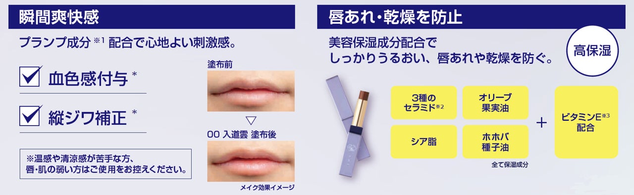 *メイクアップ効果による ※1 バニリルブチル(温感成分)※2 セラミドNP、セラミドNG、セラミドAP ※3 トコフェロール(製品の抗酸化剤) ※4 粘膜の色に近い自然な発色で元からきれいな唇を演出できるリップ
