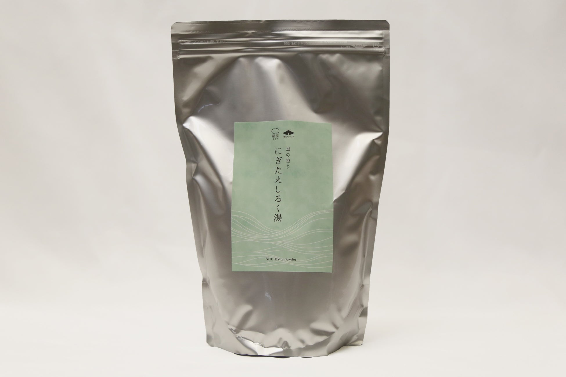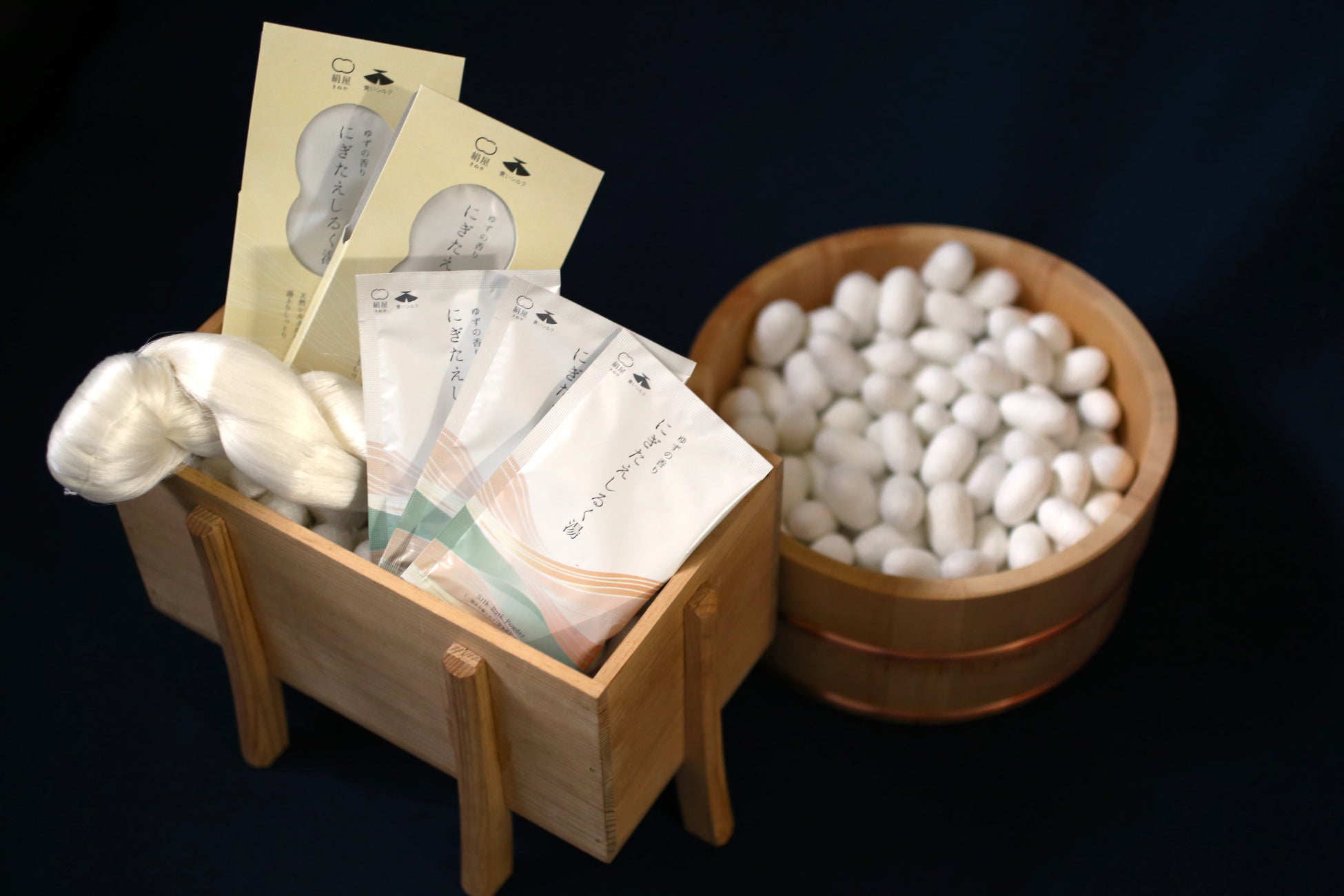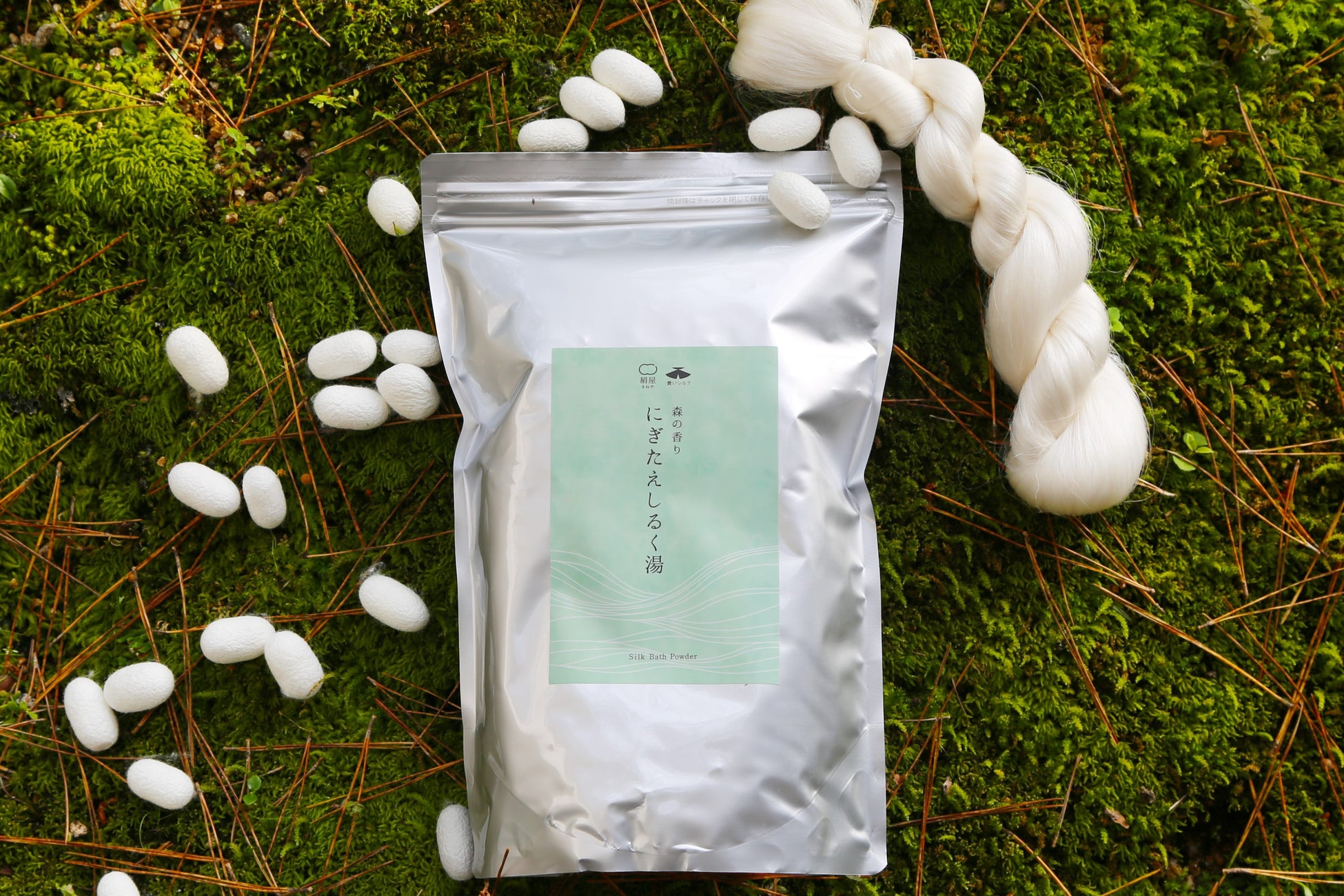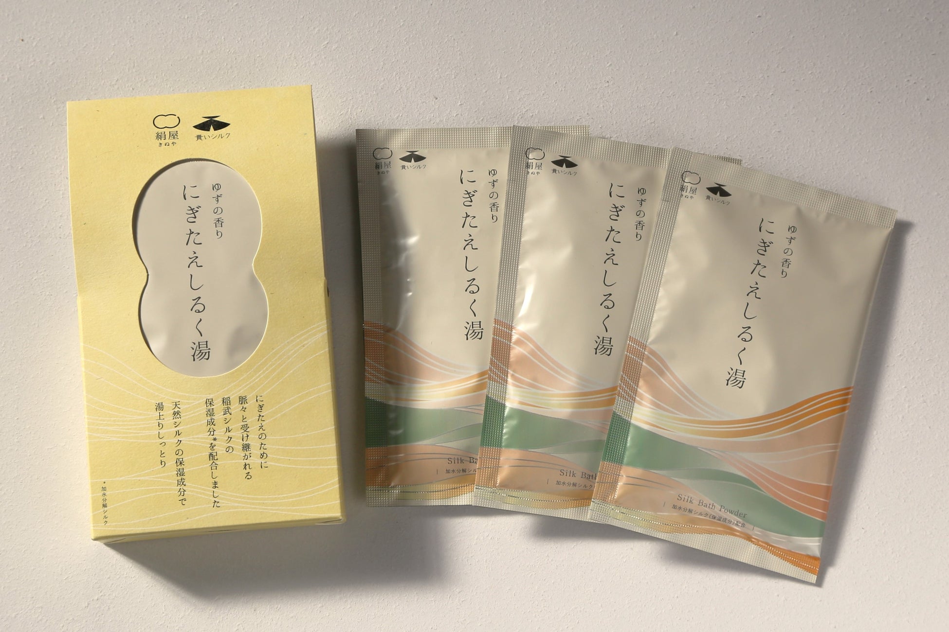 稲武の唯一無二のシルクを守り伝えるために、新ブランド『貴いシルク®』を2023年3月に立ち上げました。業務用入浴剤「にぎたえしるく湯-森の香り」の発売に先立ち、一般消費者向けに「にぎたえしるく湯-ゆずの香り」も発売しています。
