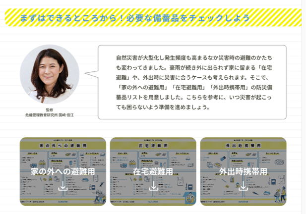 災害関連死や誤嚥性肺炎のリスクなどから守るための災害時のオーラルケアに関する情報に加え、防災備蓄品の期限切れを防ぐ「ローリングストック」の考え方の紹介、以前よりご要望いただいていた災害時の「こどもへのケア」「入れ歯のケア」項目の追加など、防災情報をアップデートしています。更に、昨今増加する在宅避難に対応し、危機管理教育研究所 国崎信江先生監修のもと、防災備蓄リストを刷新し、(1)家の外への避難用、(2)在宅避難用、(3)外出時携帯用の3種類の備蓄リストを公開しています。