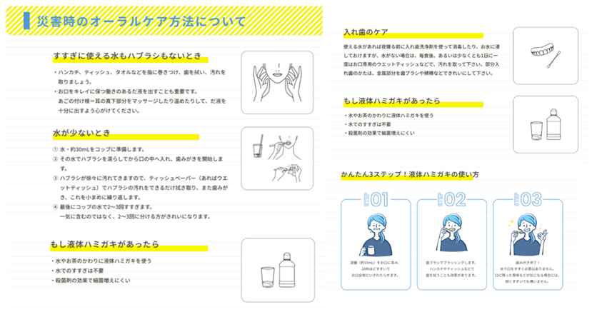 災害時には断水などで歯みがきや栄養摂取が不十分となり健康維持が困難となる状況を踏まえ、お口の健康だけでなく、体の健康を守るための対策方法や災害時に役立つ備蓄品についての情報を追加しています。