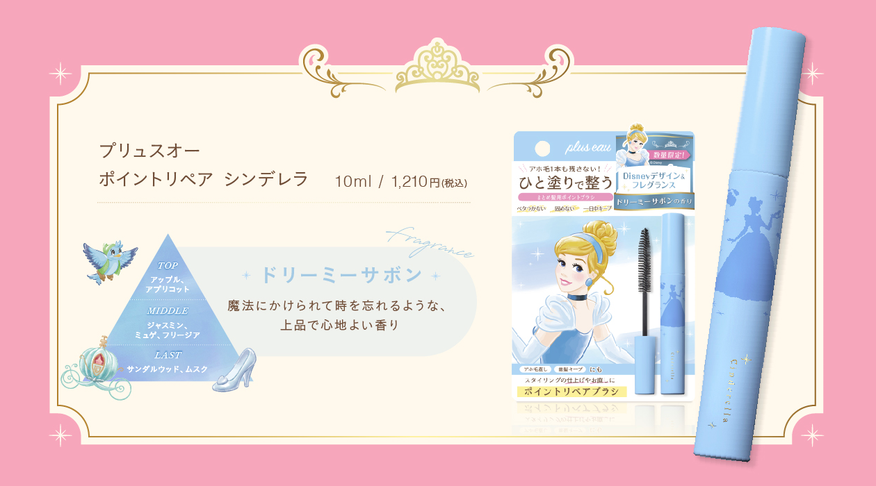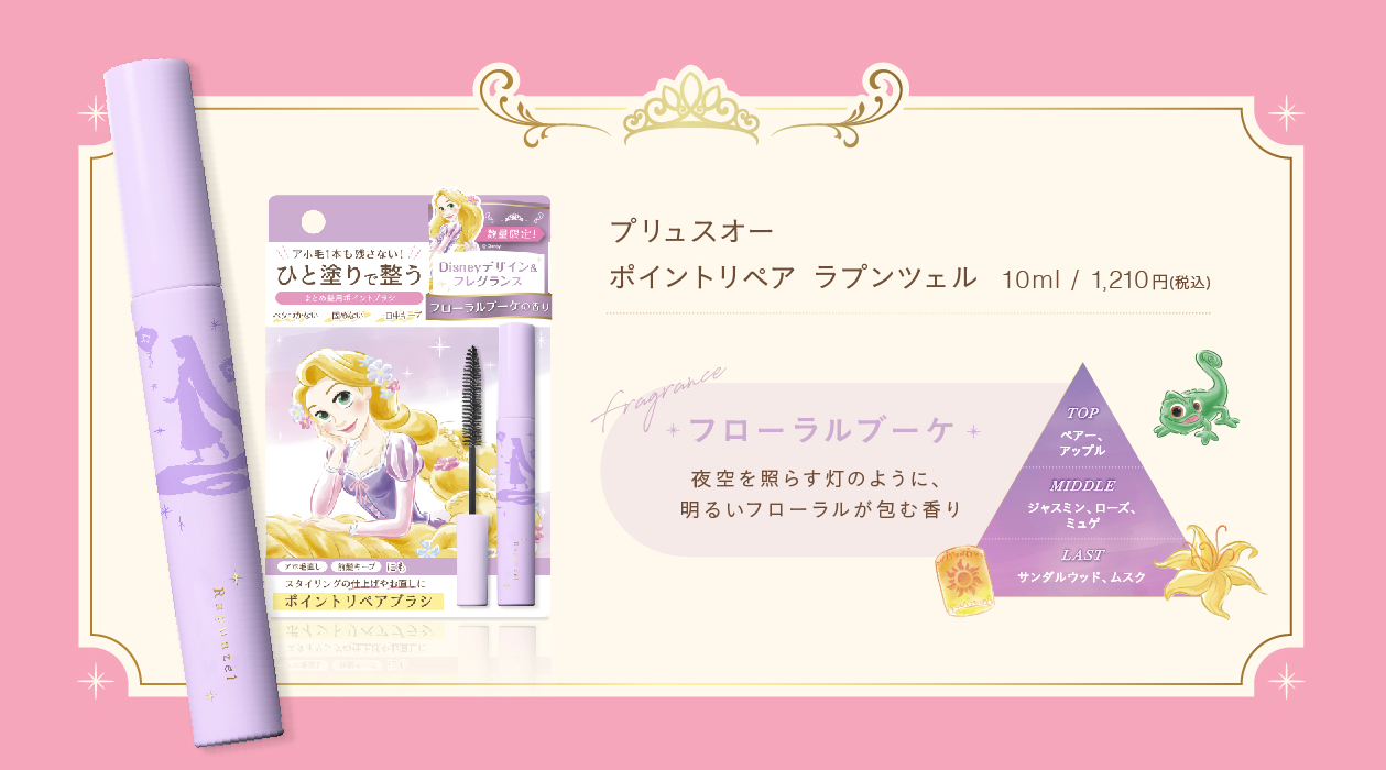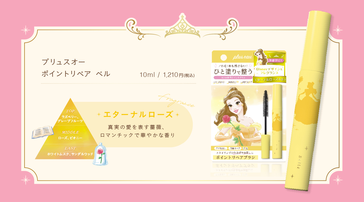 プリュスオー ポイントリペアの使いやすさとスタイルキープ力はそのままに、プリンセスたちをイメージした華やかなフレグランスを選定。ふんわりと心地よい香りが広がります。