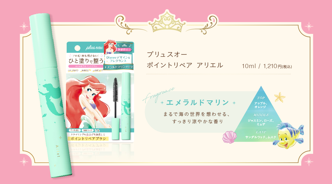 ディズニープリンセスの世界観をつめ込んだ「プリュスオー ポイントリペア ディズニー プリンセス」で、ヘアスタイルを整える仕草さえもプリンセスのように。大好きな物語を、いつもポーチに忍ばせておいてください。