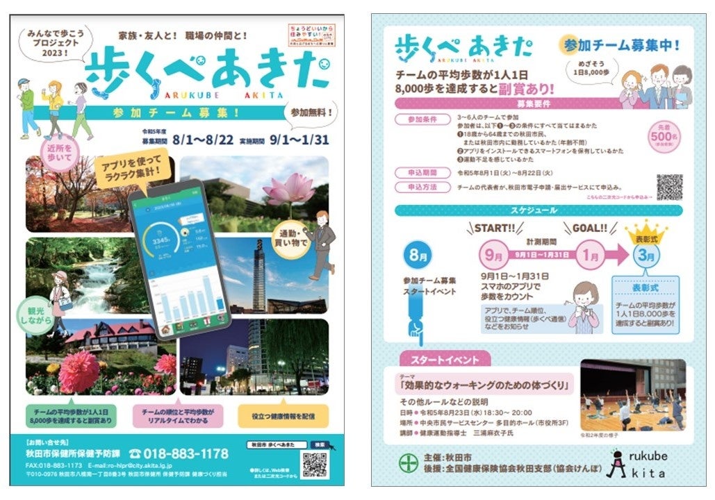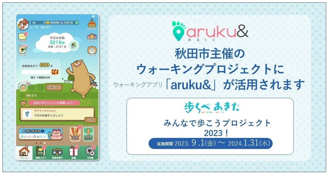 秋田市は、市民一人ひとりの健康意識の向上や継続的な健康習慣づくりを目指し、2015年より「歩くべあきた」を開催しています。しかしながら、2021年度に行った「市民健康意識調査」の結果、働く世代における「日常生活の歩数」や「運動している人の割合」が過去と比較して増加が見られず、生活習慣病の予防や体力の維持向上のため、日常生活の中で運動を習慣づけることや、身体活動量を増やす環境づくりが、引き続き大きな課題となっています。そこで、9回目となる今回の「歩くべあきた」では、イベント終了後も参加者が長期的に健康づくりに取り組めるアプリとして「aruku&」が活用されることになりました。また、イベントに加え、栄養や健康診査などの健康に役立つ情報を月に1回「歩くべ通信」としてアプリ内で発信します。秋田市では、アプリを活用した健康増進施策は初となります。自治体向けサービス「aruku& for 自治体」を導入したことで、これまで手動で入力していた各参加者の歩数は自動的にリアルタイムで集計され、参加者の端末で確認することが可能になります。期間中、チームの歩数ランキングを確認しながらゲーム感覚で気軽に楽しめます。これまで多くの自治体の健康増進施策として活用されてきたシンプルな機能とどなたでも親しみやすい画面デザインを活かしながら、秋田市の更なる健康寿命延伸に向けて、健康意識改革と運動習慣づくりの促進を図ります。