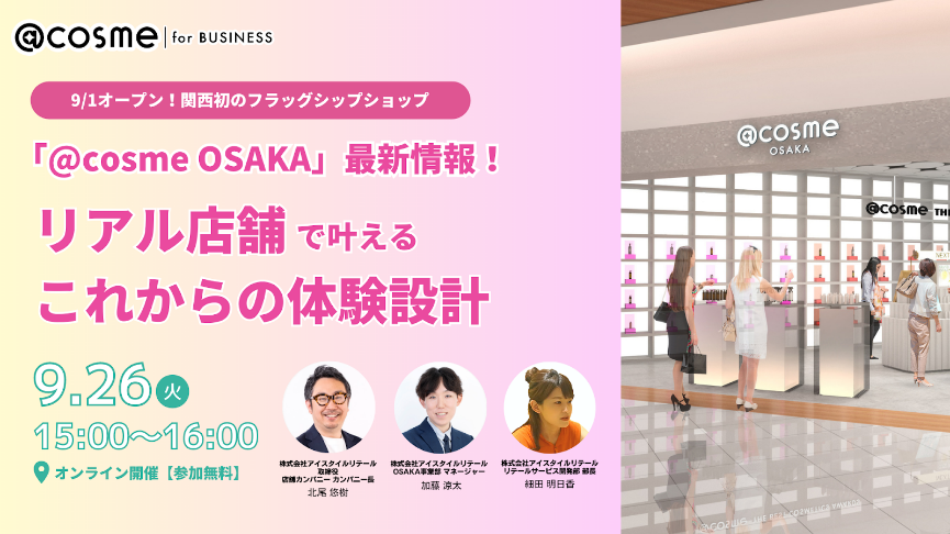 @cosme for BUSINESS(https://business.cosme.net/)では、9月26日(火)15:00より、@cosme OSAKAの魅力をいち早くお伝えするウェビナーを実施いたします。