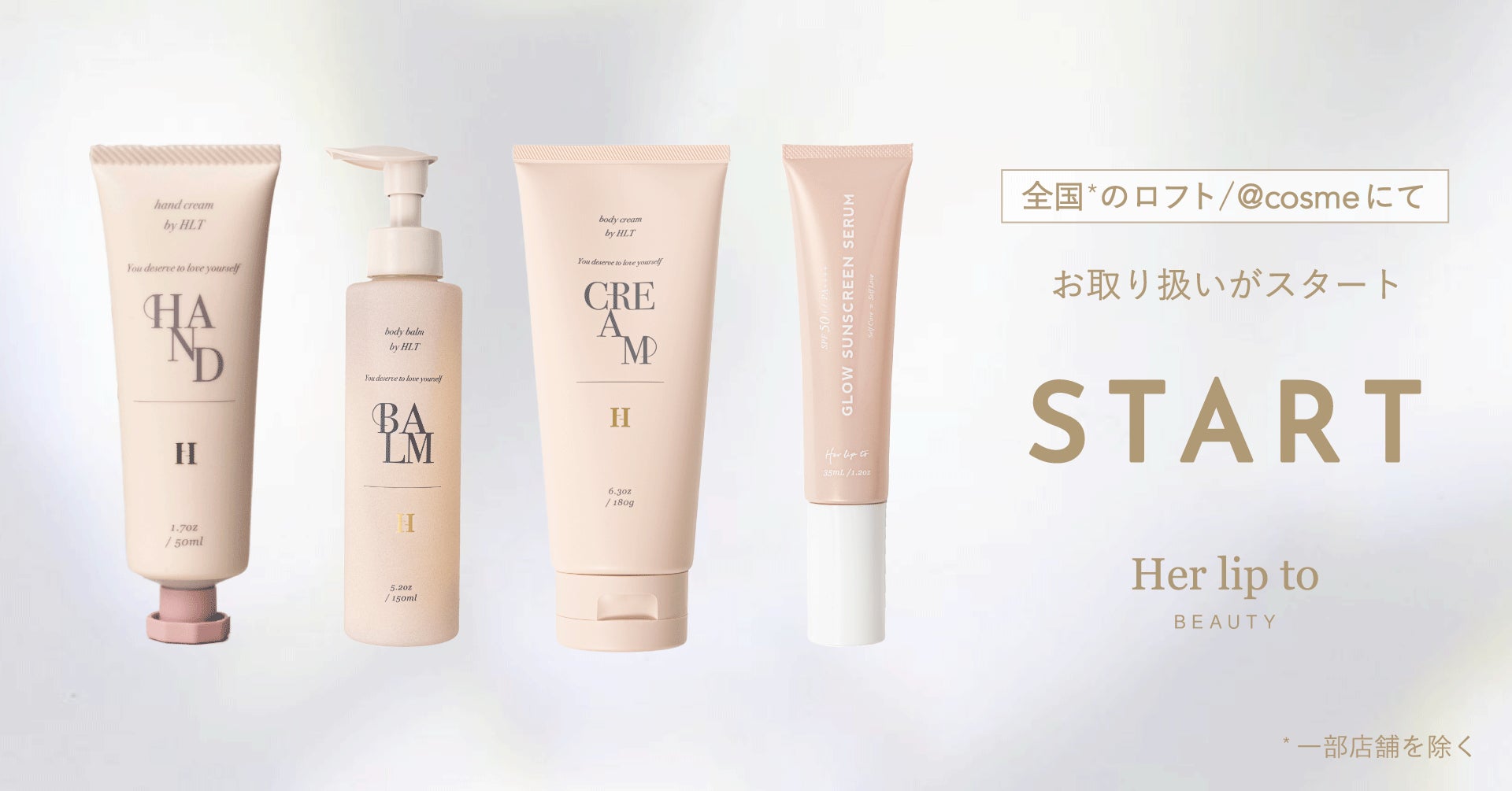 Her lip to BEAUTYで大人気のボディケアアイテム2種・UVケアアイテム1種・ハンドケアアイテム1種を2023年9月1日より、フレグランスアイテムのパフュームオイル5種・ロールオンパフュームオイル5種・UVケアアイテム1種を2023年9月29日より、全国のロフト(※)・アットコスメストアにて販売開始いたします。