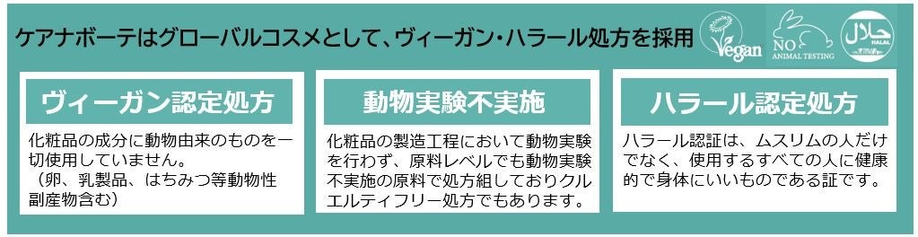 化粧品の成分に動物由来のものを一切使用していない(※2)、ヴィ―ガン認定処方を採用。