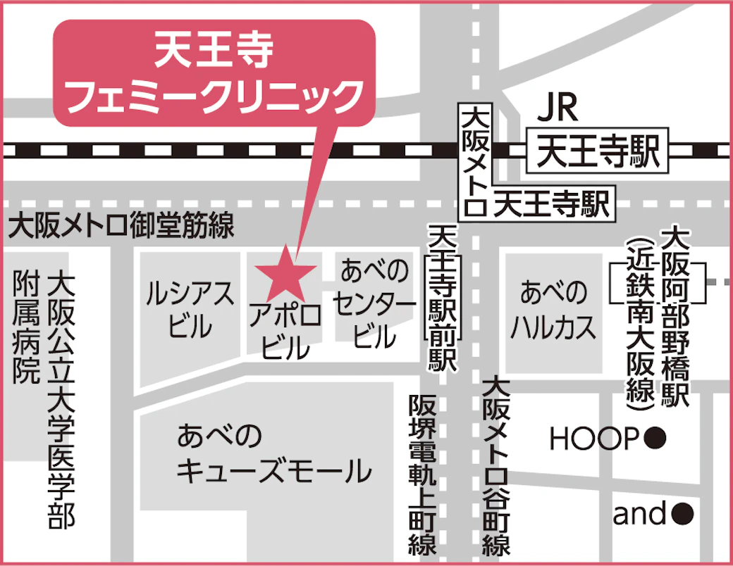 全国で7院目、大阪では3院目となる天王寺フェミークリニックは、天王寺駅から地下連絡通路直結で徒歩2分の好立地。