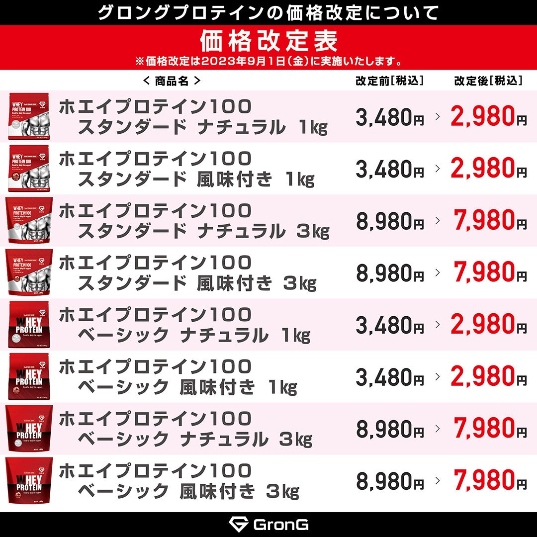 昨今、プロテイン原料の価格は安定してきております。そうした中で、「より挑戦者の多い世界の実現」を目指すGronGは、原材料費の低下をいち早く製品価格に反映し、一人でも多くのお客様の「挑戦」を応援したいという強い想いから、2023年9月1日(金)より、価格改定を実施いたします。