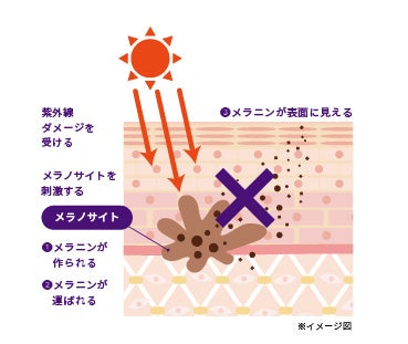 メラノソームがメラノサイトからケラチノサイトへと移動するプロセスを抑えることで、メラニン生成を抑制。シミ・ソバカスを防ぎます。