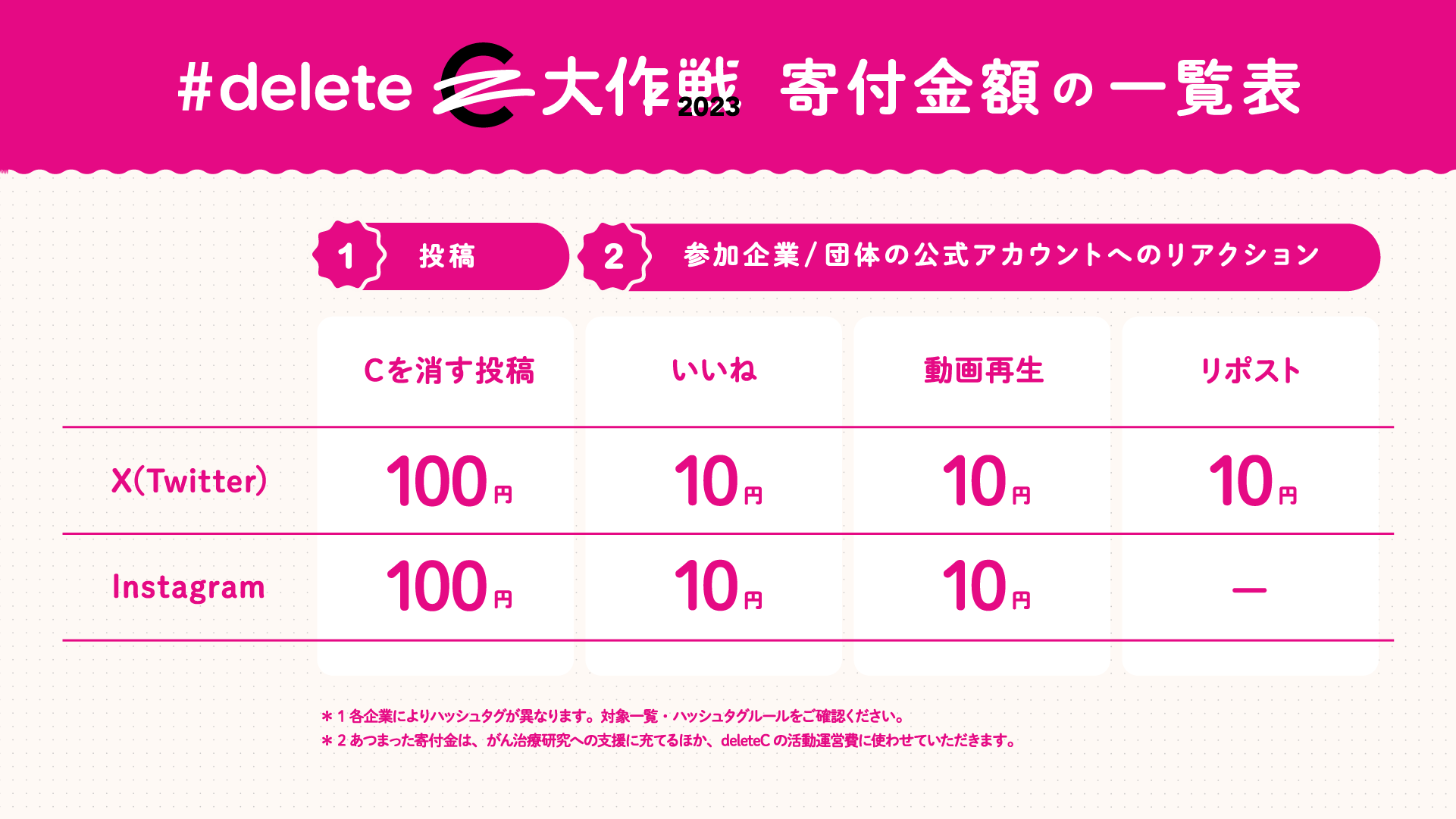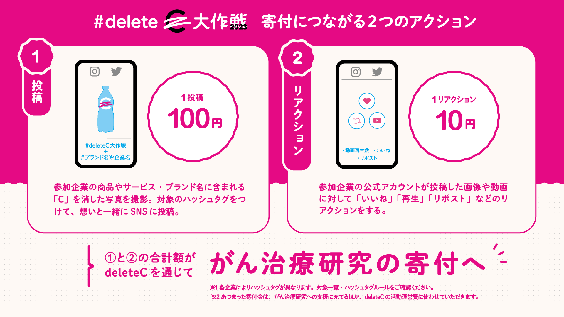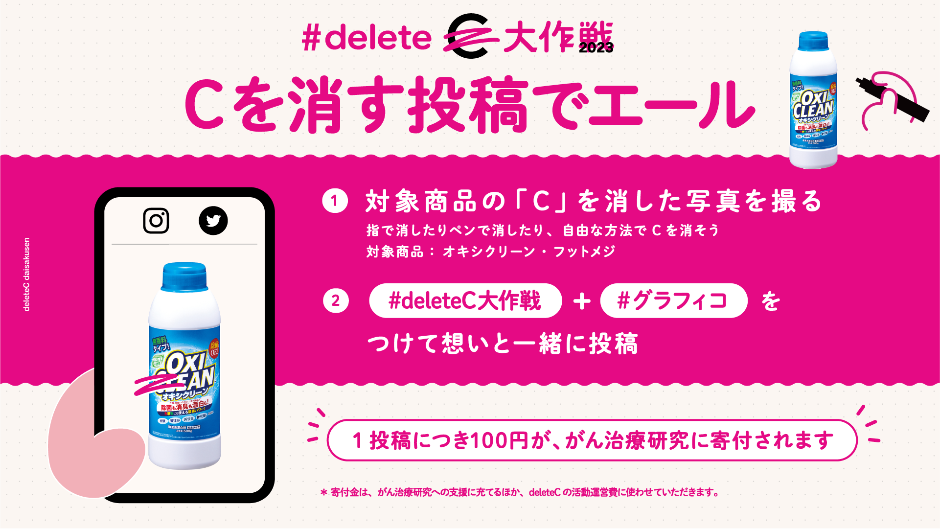 「オキシクリーン」「フットメジ」ブランドの商品やロゴに関連する「C」の部分を自由なカタチで消した画像や動画に「#deleteC大作戦」と「#グラフィコ」をつけて、参加者がSNS【X(旧Twitter)、Instagram】で投稿すると、1投稿あたり100円が、また、参加者が、グラフィコ、オキシクリーン、フットメジ、公式アカウントが発信する画像や動画をシェア/いいね/再生をすると、1シェア/1いいね/1再生/あたり10円が、がん治療研究への寄付・啓発費用として、当社からdeleteCに贈られます。