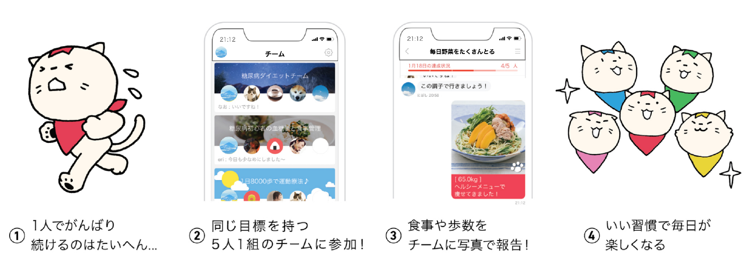 「みんチャレ」は、チームで歩く習慣を身につけられるアプリです。本事業への参加者が5人1組でチームを組み、チームメンバー同士で合計歩数目標を定めて、互いにチャット画面で励まし合いながら毎日チャレンジします。外出時に見つけた綺麗なお花や、その日の食事などの写真を毎日共有することでコミュニケーションが活性化するのと同時に、仲間との切磋琢磨によりモチベーションが高まり、運動習慣が身につきます。