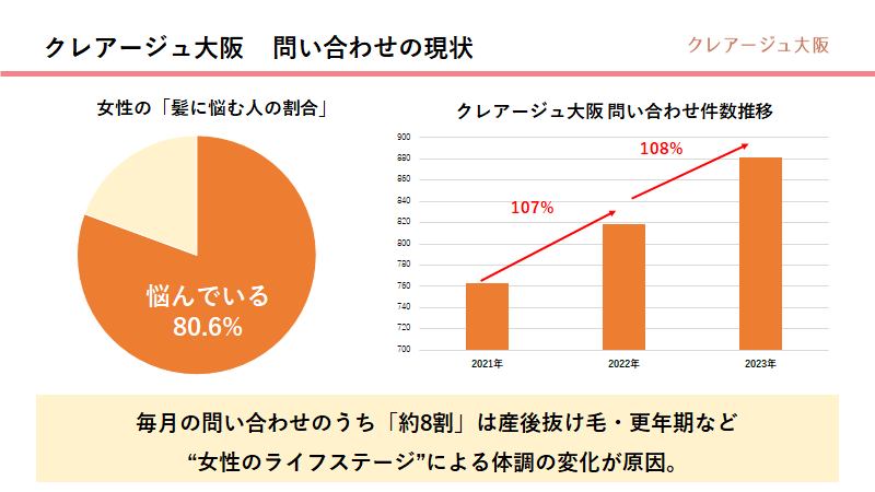 問い合わせの約8割は、妊娠・出産、ストレス、更年期、閉経など、女性特有のライフステージにおける変化のお悩みです。頭髪治療は、年々問い合わせ件数が増加しているのですが、増加の背景としては、「女性の社会進出」が大きな要因だと考えられます。また、抗がん剤治療やコロナ感染症の後遺症による抜け毛などの相談は、毎月2割程度寄せられています。