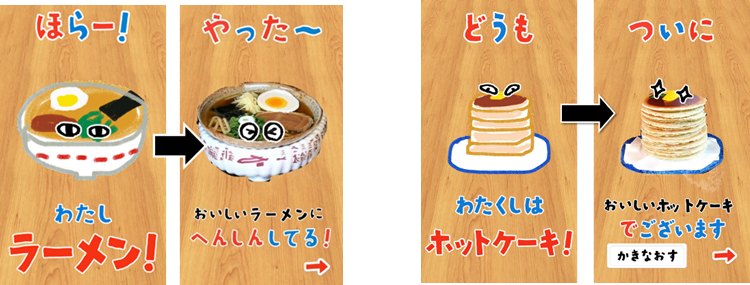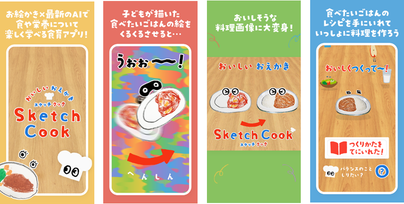 「おいしいおえかき SketchCook」は、子どもが描いた料理の絵をスマートフォンのカメラで撮影すると、料理のメニューを判別し実物の料理に近い画像へと変身させるとともに、その“料理のレシピ”と適切な栄養バランスを補完する“食べ合わせメニューのレシピ”を提案する食育アプリとして、多くの場面で活用されてきました。