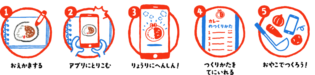 子どもたちが描いた料理の絵を、スマートフォンで撮影すると、実物の料理に近い画像へと変身させます。さらに栄養バランスを考えた料理のレシピと、適切な食べ合わせを提案。おえかきを通して、親子で楽しく食や栄養のことを学べる食育アプリです。