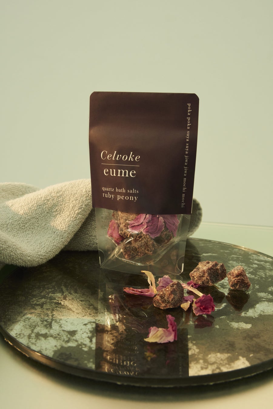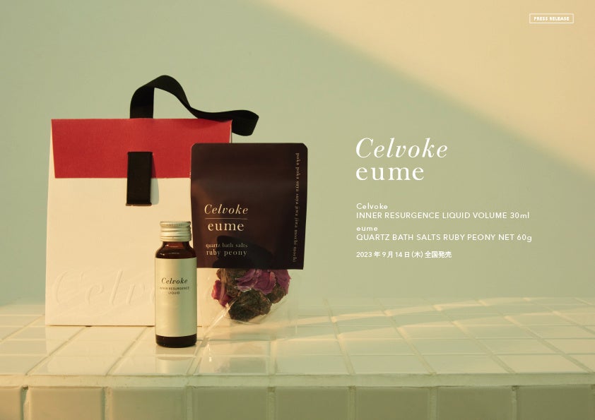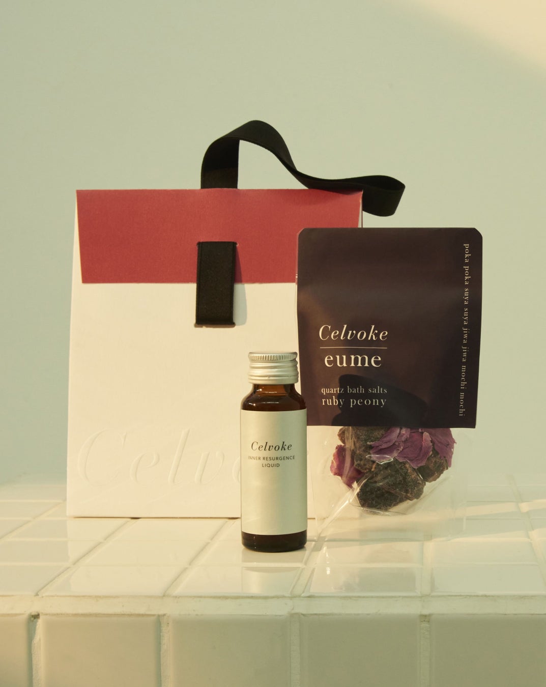 Celvokeで人気の「インナーリサージェンスリキッド」と、Celvoke×eume の限定バスソルト「クォーツバスソルトルビーピオニー」が セットになったスペシャルな限定品が登場。 自分へのご褒美に、大切な方へのギフトとしてもおすすめです。 至福のバスタイムで自分だけのバスタイムフルネスを。