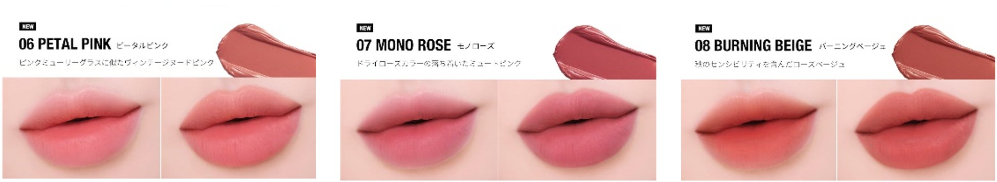 価格:税込¥1,400円 カラー:6号ピータルピンク、7号モノローズ、8号バーニングベージュ(新色)