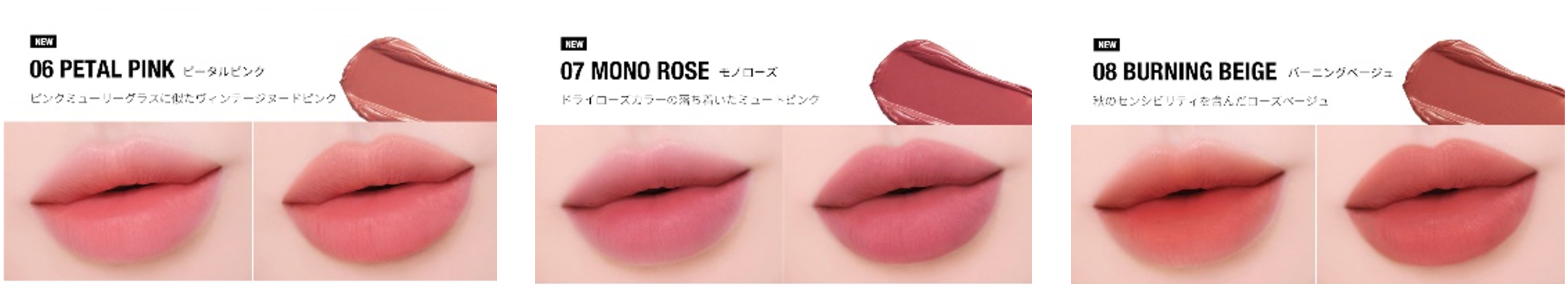 価格:税込¥1,400円 カラー:6号ピータルピンク、7号モノローズ、8号バーニングベージュ(新色)