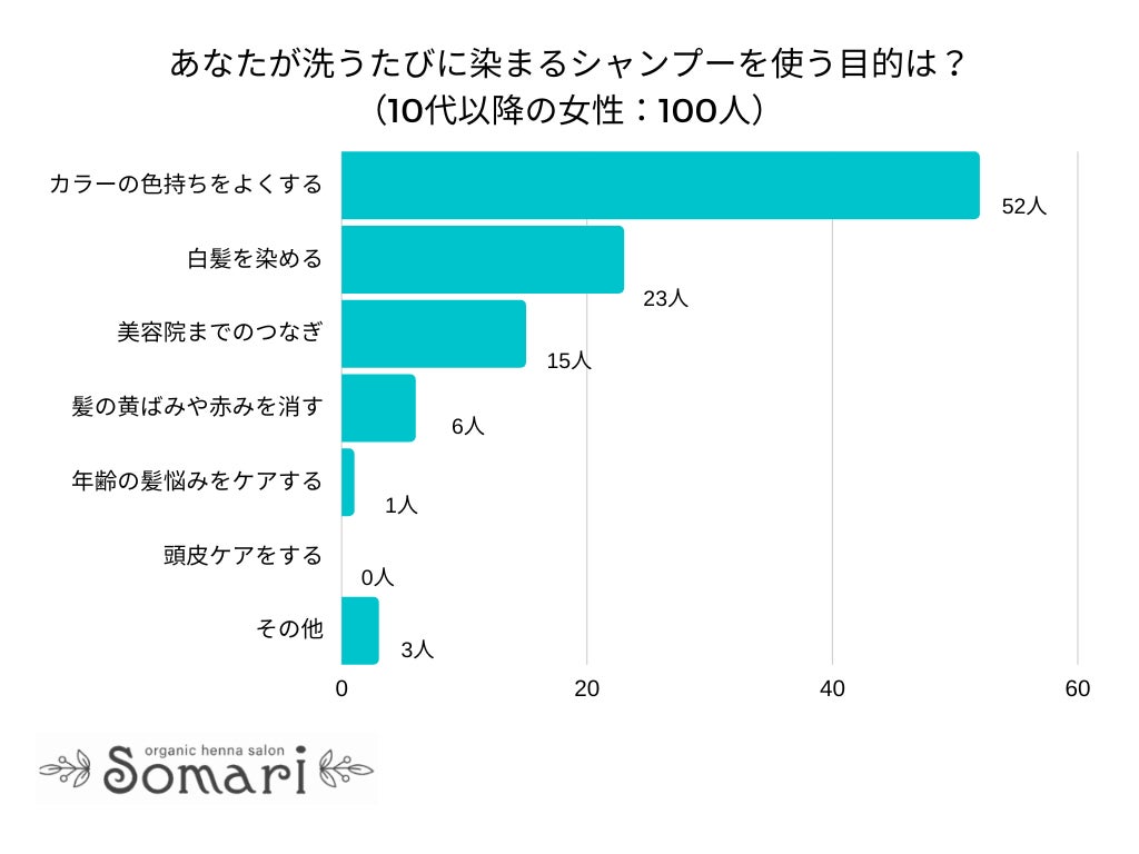 株式会社AWA(https://a-w-a.co.jp/)が運営する地域密着型白髪染め専門美容室ソマリ(https://a-w-a.co.jp/hennasalonsomari/)は、日本全国の10代以上の女性を対象に「あなたが洗うたびに染まるシャンプーを使う目的は?」とアンケート調査を実施しました。