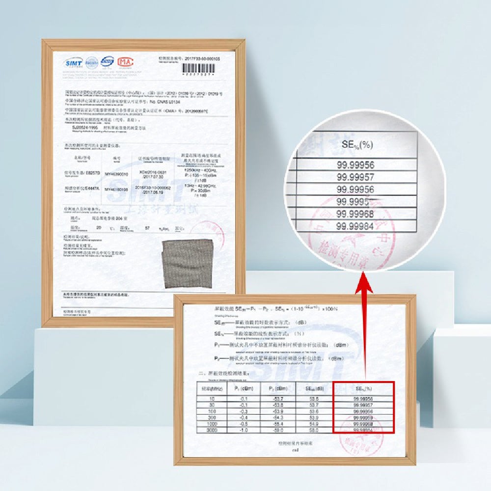 ※上海計量試験機関によるテストでは、30~3000MHzの周波数範囲内の電磁波環境で、遮断性能が99.9999%と測定されました。