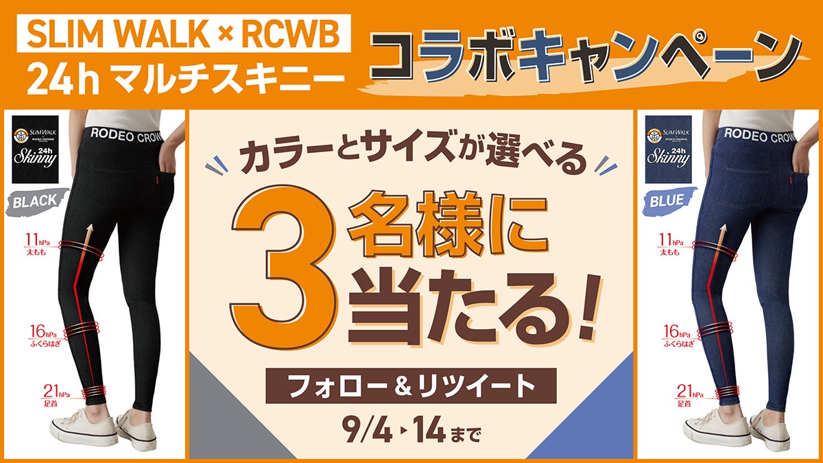 SLIMWALKとRODEO CROWNSでは、コラボ商品の発売を記念して、「SLIMWALK×RCWB 24hマルチスキニー」が抽選で3名様に当たるプレゼントキャンペーンを実施します。