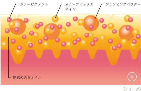 プランピングパウダーと艶感のあるオイルを配合することにより、立体感のある艶仕上がりを実現。塗膜の厚みで唇をふっくらして見せるだけでなく、高い透明感と適度な塗膜の厚みで鏡面のようになめらかで奥行きのある艶を演出します。さらに吐息などから蒸発する水分を取り込んで、ジェル状の塗膜に変化し唇に密着するカラーフィックスオイルにより、長時間の色もちを叶えます。