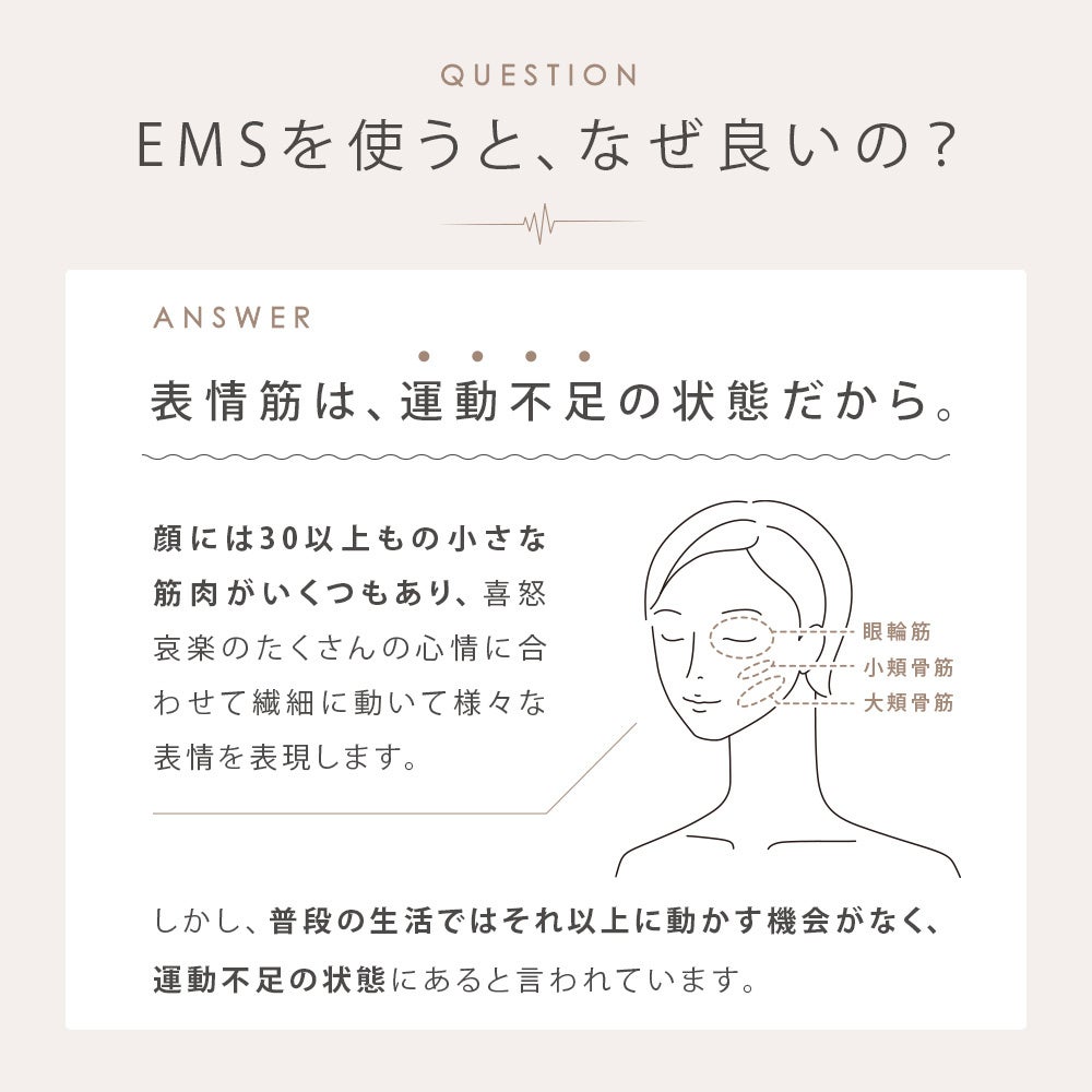 電気の刺激によって、筋肉を収縮弛緩運動させ、普段動かさない筋肉(表情筋や頭筋)を刺激します。EMSは元来、医療現場でリハビリなど、筋肉運動の補助を目的として使われていました。