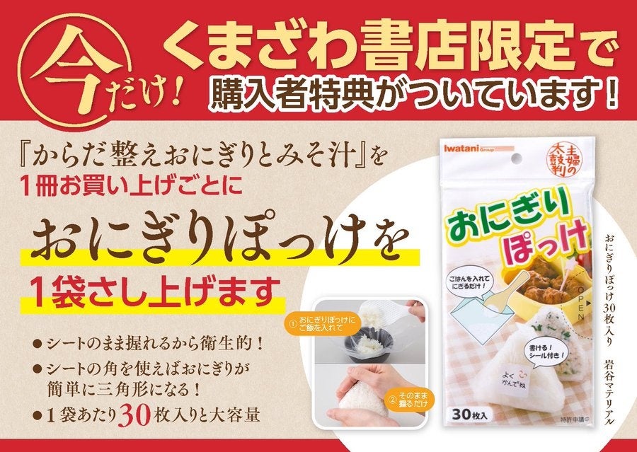 主婦と生活社から好評発売中の『からだ整えおにぎりとみそ汁』(藤井恵・著)のくまざわ書店限定購入特典として、1冊お買い上げごとに、簡単&衛生的におにぎりをにぎることができる便利なシート“おにぎりぽっけ”を1袋差し上げます。