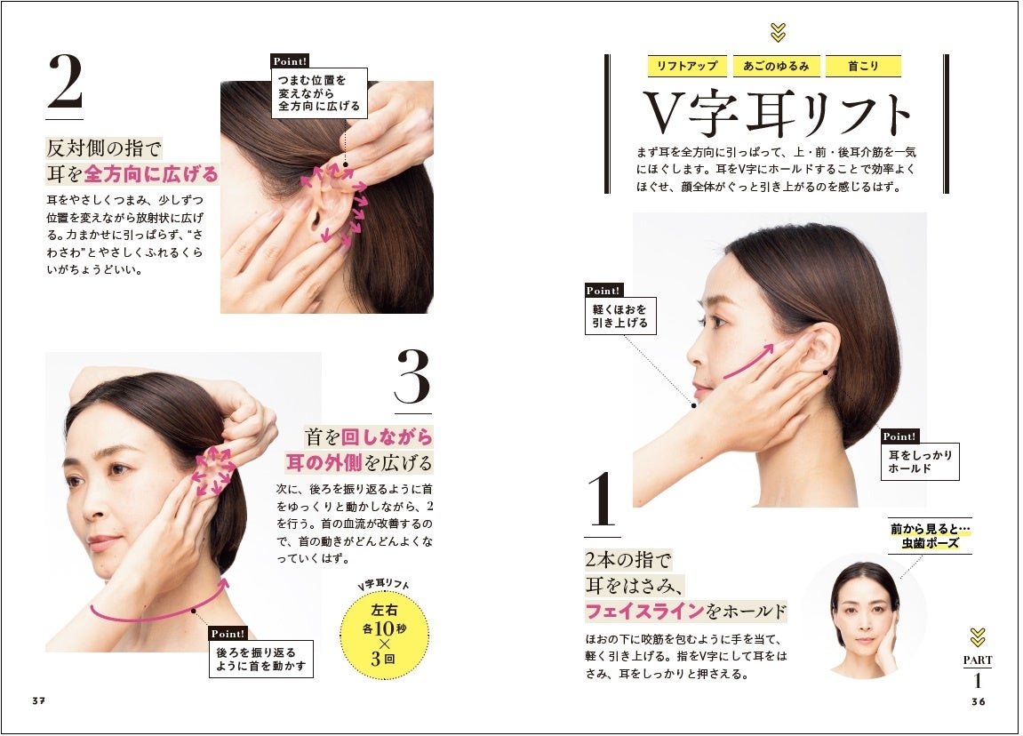 「顔をリフトアップするには、まず耳まわりからケアするのが正解です」と村木さん。耳の周りには顔や頭につながる血管が通り、リンパ節も集中。耳まわりをほぐせばめぐりを一気に改善し、顔を立体的に引き上げることができるのです」と、「V字耳リフト」「たるみ筋はがし」「耳ぎょうざポンプ」というユニークなメソッドを伝授。10秒ほどで顔がぽかぽかとし、斜めに垂れ下がった顔がぐっと引きあがります。
