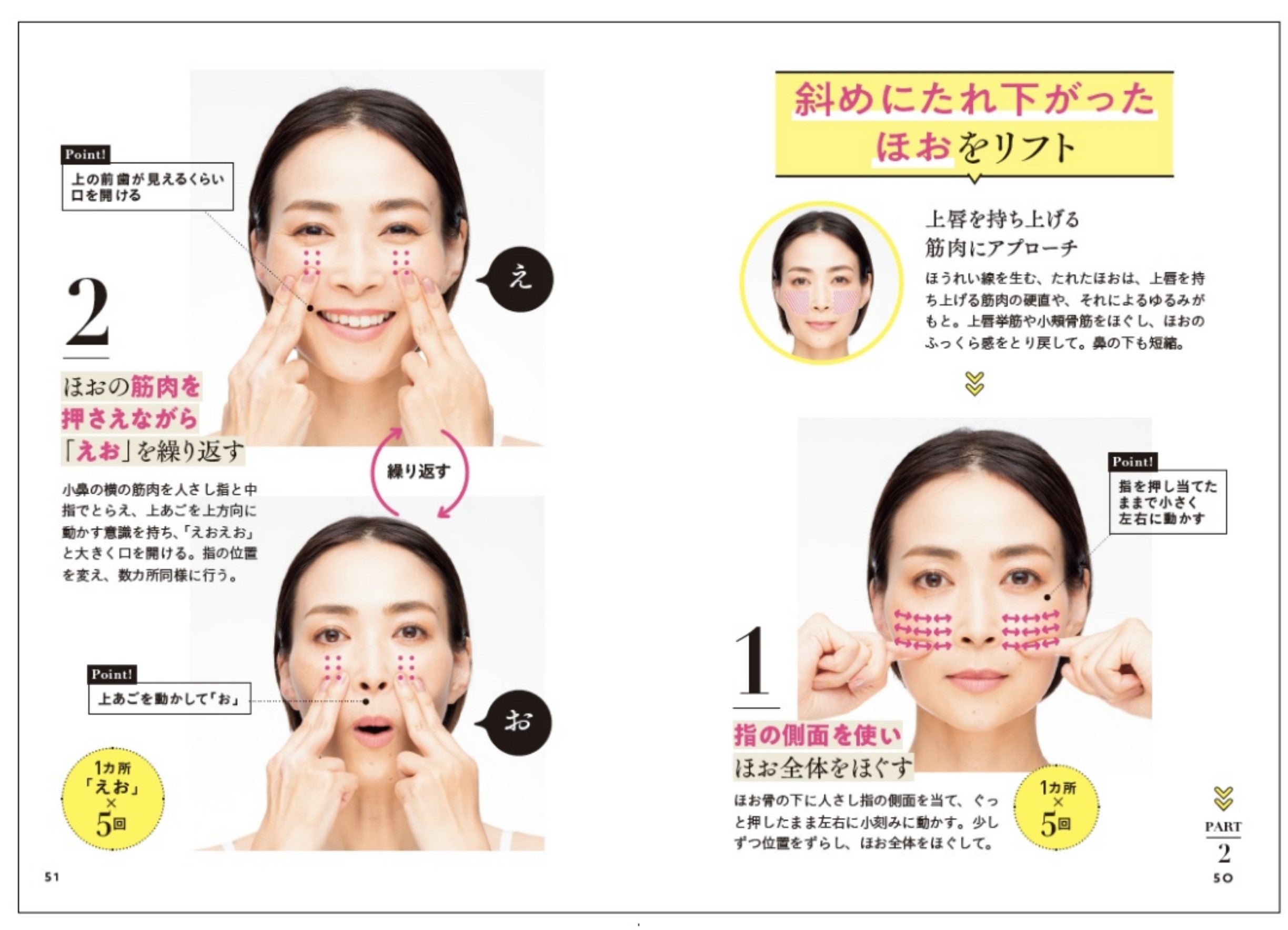 「ほうれい線やあごのたるみに目が行きがちですが、それ以外にも顔を老けさせる大きな原因があります。鼻の下や小鼻、唇、目元のたるみです。自分でも気づきにくい老け見えポイントと、それをリフトアップする方法もお伝えしています」。