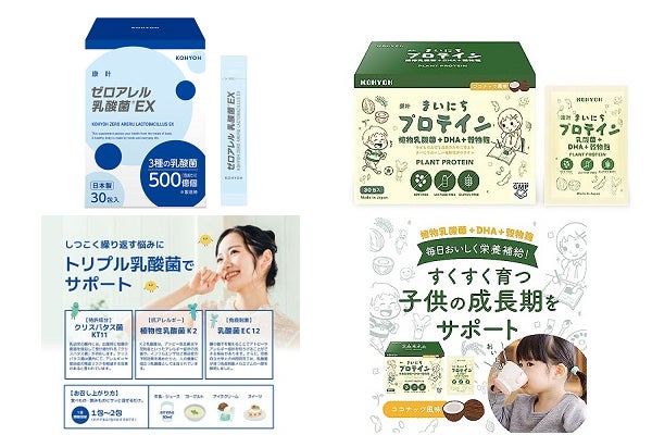 一番人気の「まいにちビフィズス菌」「ビフィズス菌⁺(ビフィズス菌プラス)」、お子様の成長期をサポートする「海藻の力」「アセロラの力」、100種類以上の原料から1年半の歳月をかけて作られた酵素ドリンク「植物発酵原液」に加え、この度新たなラインナップとして「ゼロアレル乳酸菌® EX」と「まいにちプロテイン」をリリースいたしました。