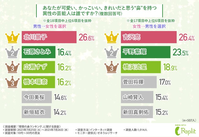 そこで今回、『隆鼻(りゅうび)矯正専門店ラプリ』(https://raplit.com/)を運営する株式会社ラプリは、10代~30代の男女を対象に、「理想の鼻ランキング」に関する調査を実施しました。