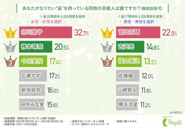 女性には自分がなりたい鼻を持つ女性芸能人を、男性には男性芸能人を選んでいただきました。