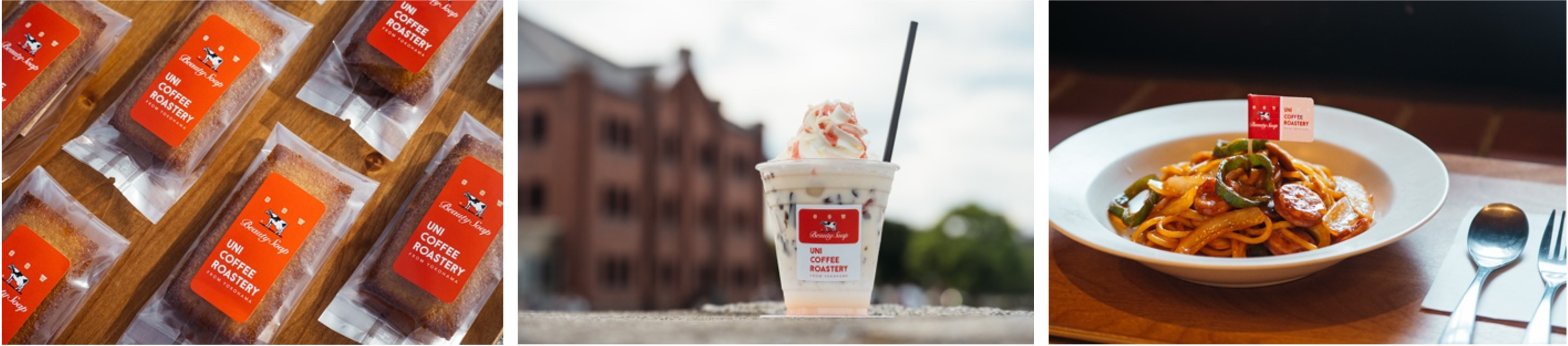 横浜発祥の人気カフェ「UNI COFFEE ROASTERY」にて赤箱コラボの限定メニューが登場します。赤箱のシンボルである牛柄をコーヒーゼリーで表現したコーヒーゼリーラテや、赤箱に使用されている高品質のミルクバターを使ったミルクフィナンシェを発売。ラテとフィナンシェは「UNI COFFEE ROASTERY」(11店舗・レストラン除く)にてお買い求めいただけます。また、横浜赤レンガ倉庫店限定でお召し上がりいただける、赤箱とコラボした「赤箱コラボ横濱ナポリタン」も登場。赤箱のパッケージデザインの旗がのっているほか、赤箱にも使用されている高品質のミルクバターによって味付けされており、コク深い味わいのナポリタンです。