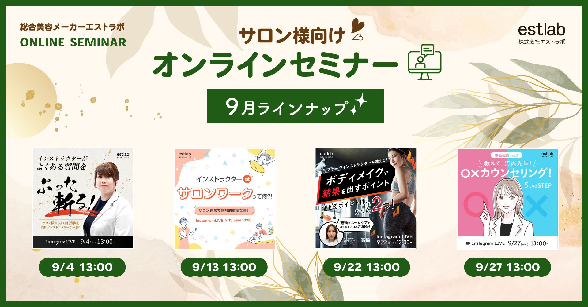 本セミナーは、多くのエステサロン様から寄せられる”お悩み”にお応えするべく、数々の実績を積んだセールスコンサルタントとインストラクターが様々なテーマで解決策をご提案する無料オンラインセミナーです。