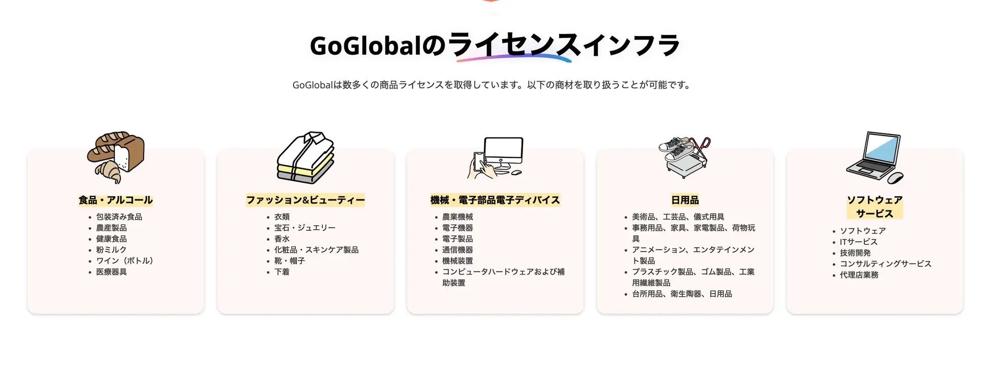 GoGlobalなら既に数多くの商品ライセンスを取得していることから、以下の商材を取り扱うことが可能です。