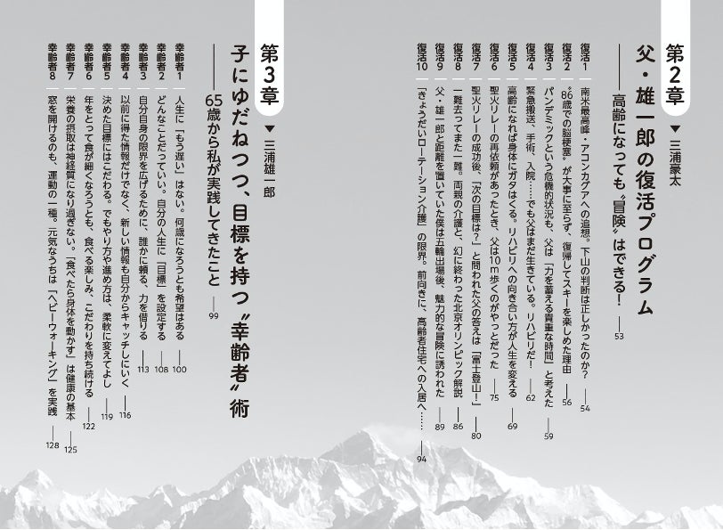 2020年の要介護4の状況から2023年夏の富士登山への挑戦まで、その復活の軌跡を、サポートしてきた息子の豪太さんとともに語る本書は、夢や希望を失いかけているシニア層や障がい者の方たちだけでなく、高齢の親をもつ子ども世代(ミドル層)にも非常に役立つ内容です。