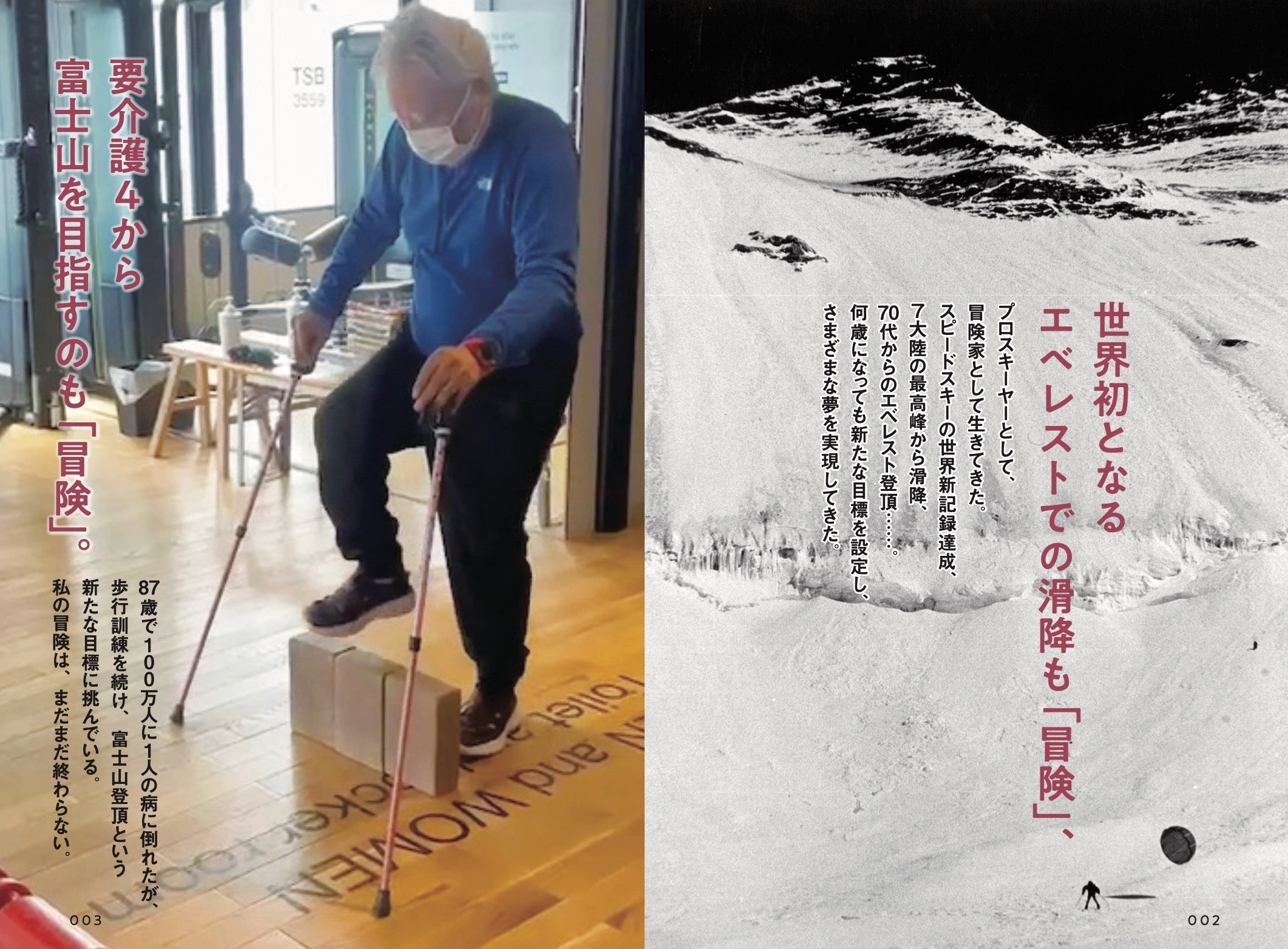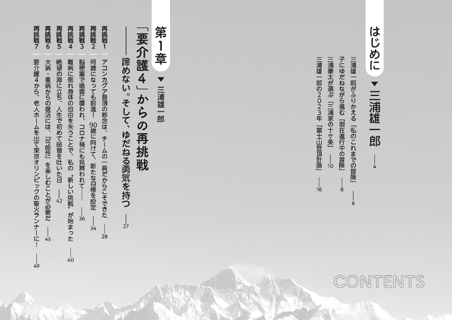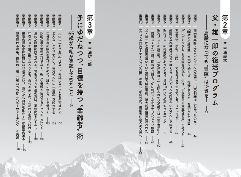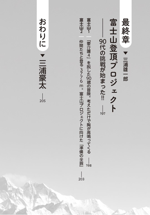 2020年の要介護4の状況から2023年夏の富士登山への挑戦まで、その復活の軌跡を、サポートしてきた息子の豪太さんとともに語る本書は、夢や希望を失いかけているシニア層や障がい者の方たちだけでなく、高齢の親をもつ子ども世代(ミドル層)にも非常に役立つ内容です。