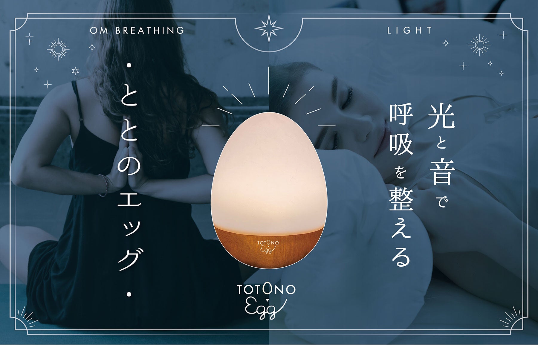 「ととのエッグ」は、心や気持ちを落ち着かせ、くつろぎの時間を光と音でサポートする製品です。たまご型のルームライトとしての役割を果たすこの製品は、2つの呼吸法に合わせてライトがゆっくりと点灯と消灯を繰り返し、自然な「深い呼吸」をガイドします。さらに、心を落ち着かせる音として「クリスタルボウル」「シンギングボウル」のやわらかい音が加わり、リラックス効果を高めます。