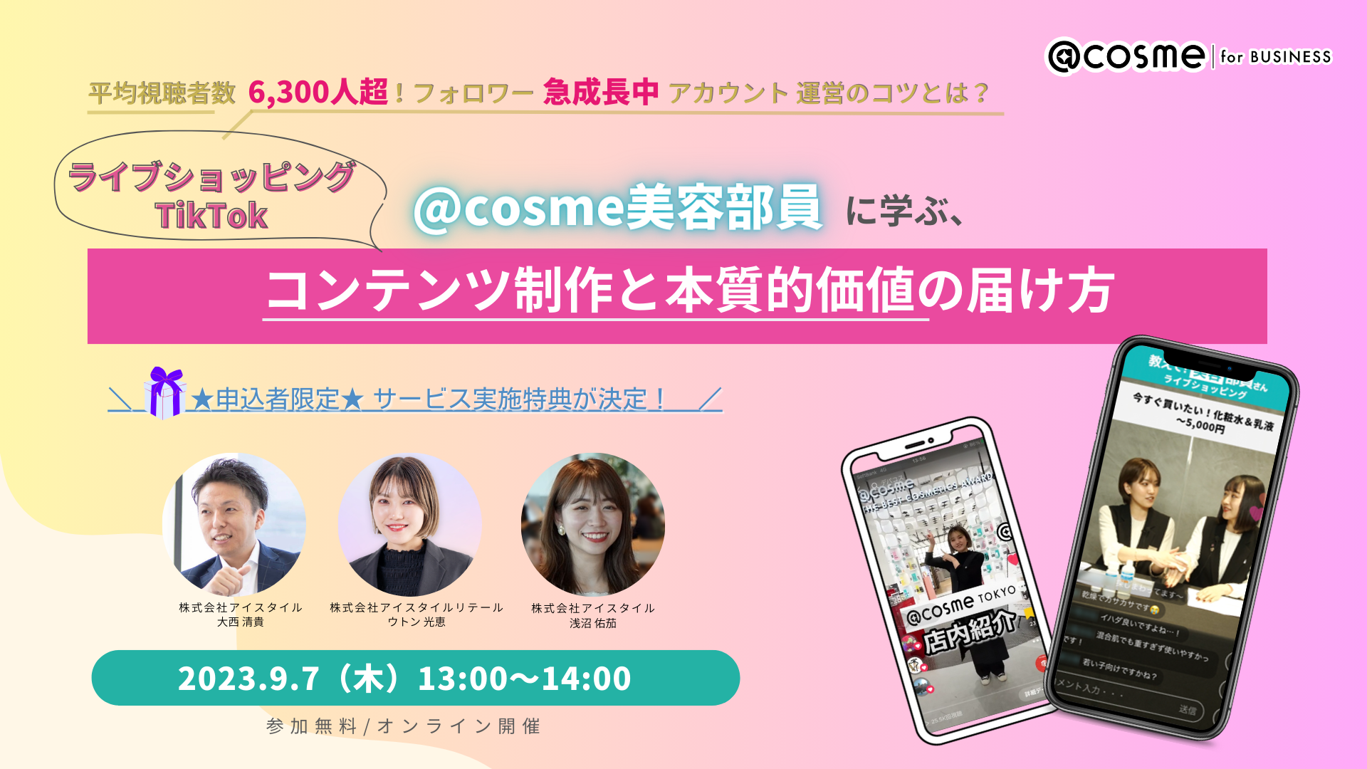 株式会社アイスタイル(代表取締役社長:遠藤 宗)は、2023年8月7日(木)に、ウェビナーイベント『申込特典あり!@cosme美容部員に学ぶ、ライブショッピング・TikTokコンテンツ制作と本質的価値の届け方』を開催することをお知らせいたします。