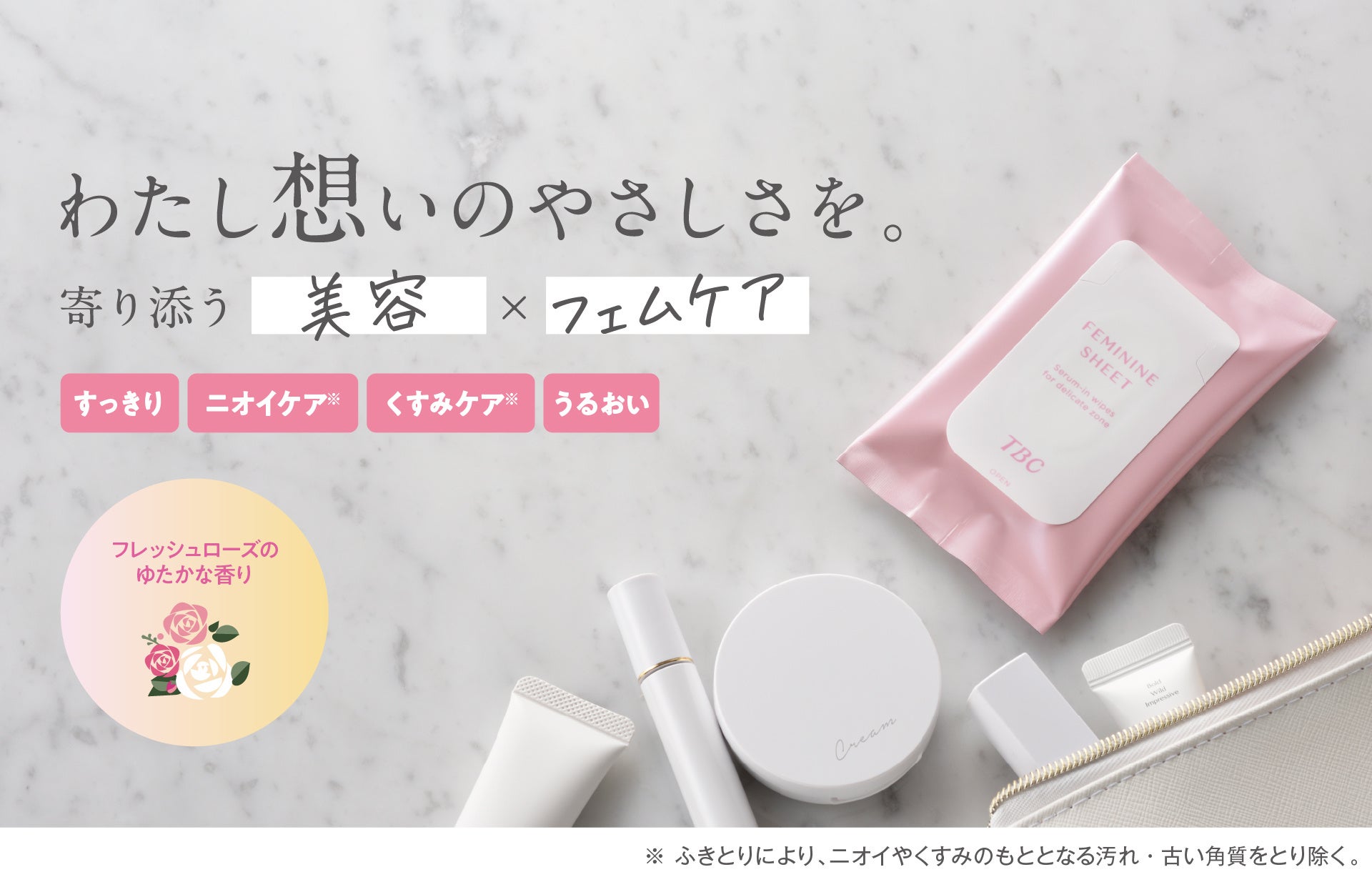 「TBC フェミニンシート」は、ビタミンB12※2 由来のピンク色の化粧液含浸シートで、VIOの気になるニオイや汚れをすっきりふきとり&スキンケアする、シート状ふきとり化粧液です。やわらかな肌あたりのシートで不快感のもと※3 をやさしくふきとりながら、美容液成分※1 98%配合の化粧液で、同時に美容スキンケアができます。