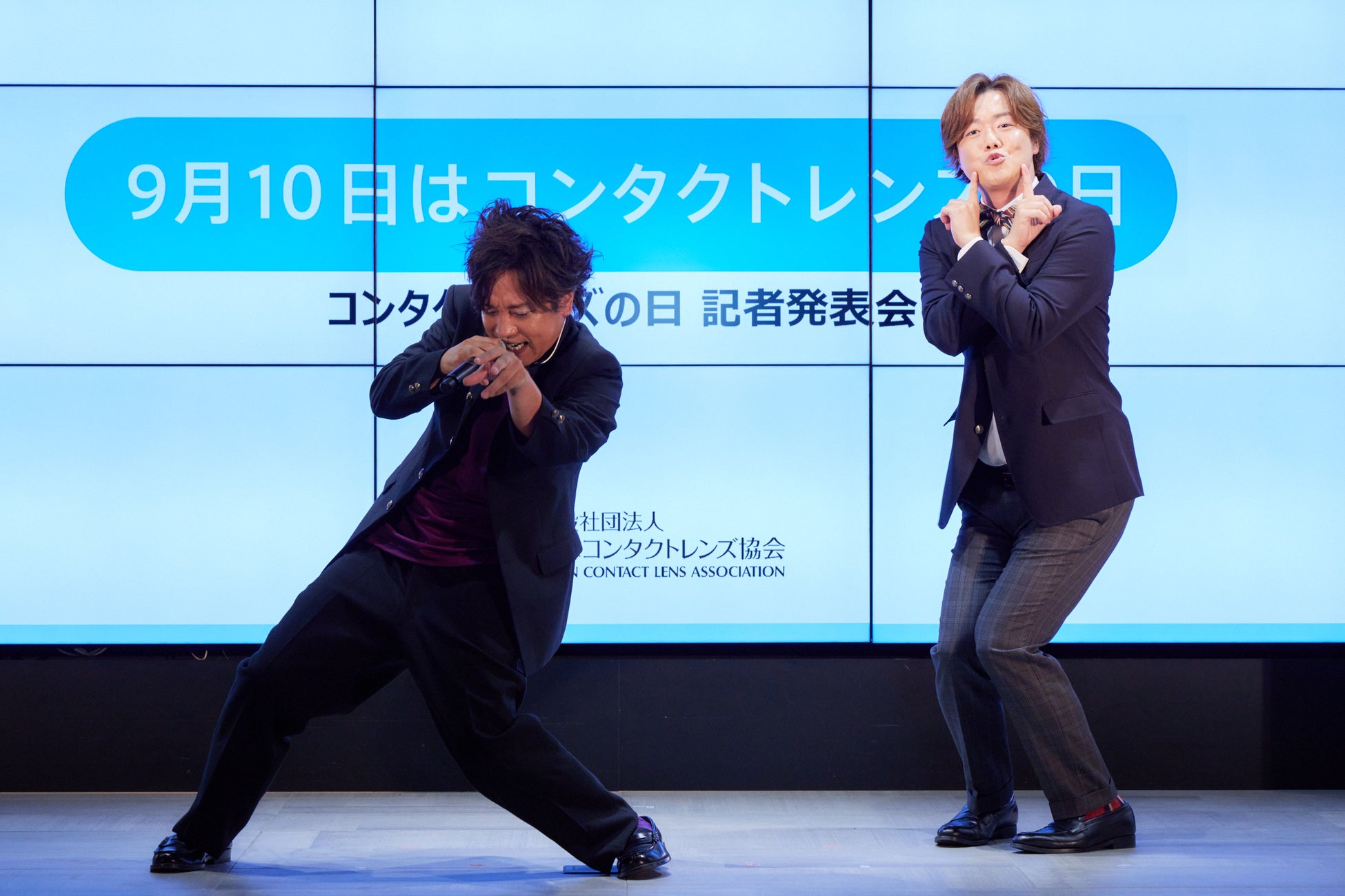 最後に、公益社団法人日本眼科医会制作の、正しいコンタクトレンズの使用方法を呼びかける「ケアケアダンス」動画を公開後、「ぺこぱ コンタクトレンズの日スペシャルバージョン」として、松陰寺さんが歌い、シュウペイさんがダンスを披露してくれました。ダンスと歌で会場を沸かせた後に、ご自身のパフォーマンスについての感想を伺うと、松陰寺さんは「オケ入っているかと思ったらソロで、キーが高くなってしまったんですが、92点!」、シュウペイさんは「キャッチーなメロディーで記憶にも残りやすいですし、最後のポーズも自由に決められそうなので、流行りそうですね。シュウペイポーズにちなんで出来栄えは11点!」とコメントしました。