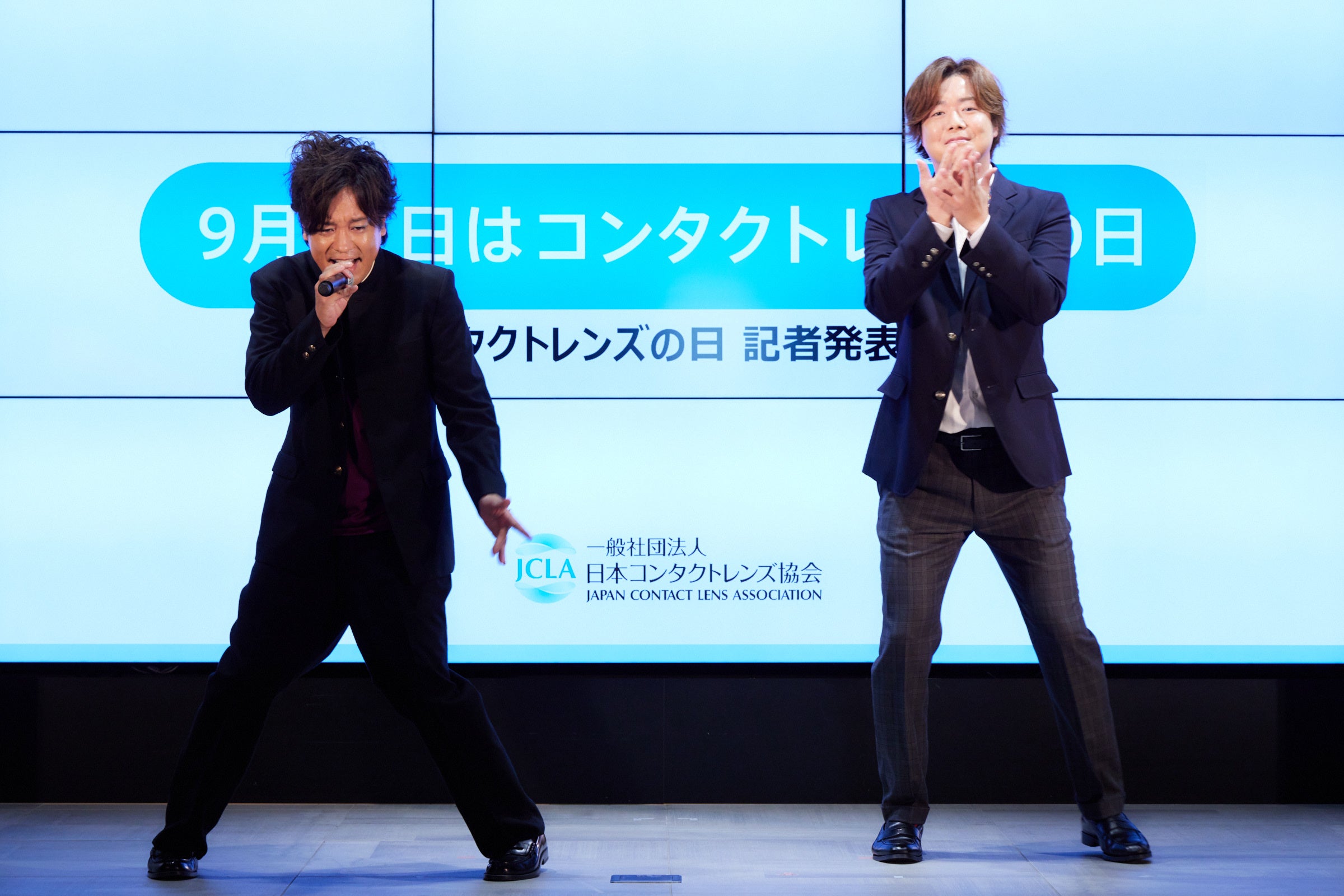 最後に、公益社団法人日本眼科医会制作の、正しいコンタクトレンズの使用方法を呼びかける「ケアケアダンス」動画を公開後、「ぺこぱ コンタクトレンズの日スペシャルバージョン」として、松陰寺さんが歌い、シュウペイさんがダンスを披露してくれました。ダンスと歌で会場を沸かせた後に、ご自身のパフォーマンスについての感想を伺うと、松陰寺さんは「オケ入っているかと思ったらソロで、キーが高くなってしまったんですが、92点!」、シュウペイさんは「キャッチーなメロディーで記憶にも残りやすいですし、最後のポーズも自由に決められそうなので、流行りそうですね。シュウペイポーズにちなんで出来栄えは11点!」とコメントしました。